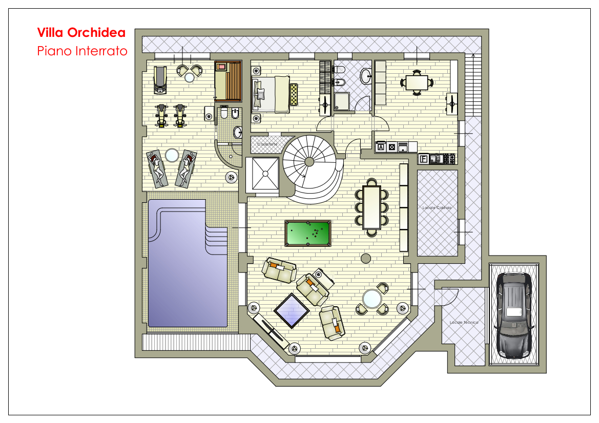 Al piano interrato troviamo : garage con posti auto a cui si accede con comoda piattaforma meccanica , locale tecnico impianti , lavanderia , area fitness con sauna , bagno turco , spogliatoi e bagno , piscina con idromassaggio ,altri locali da definire destinazione , tutti i locali del piano interrato godono di luce diretta e ricambio di aria grazie alle ampie finestre sullo scannafosso perimetrale.