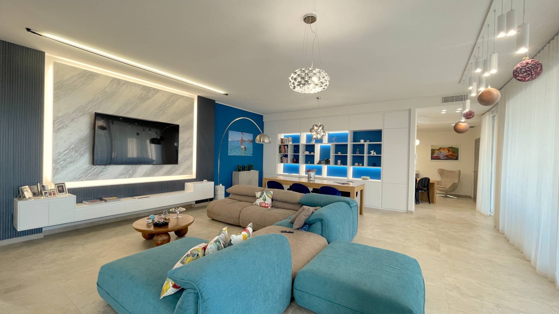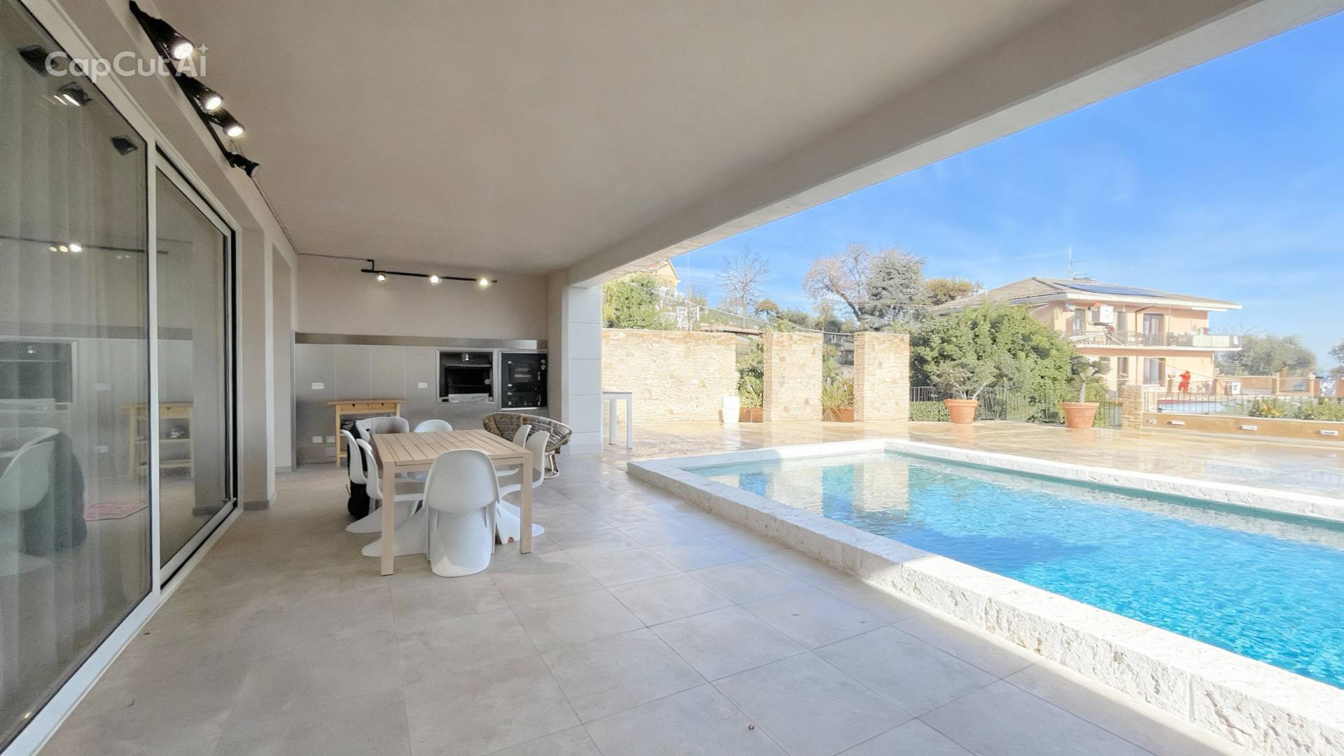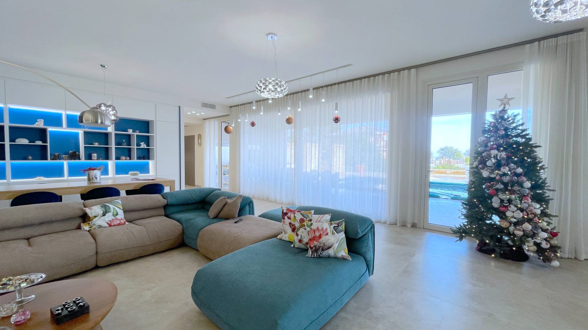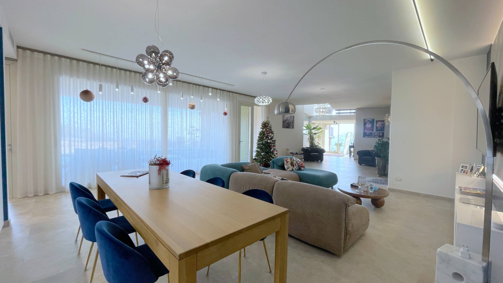 Davanti al living si sviluppa una loggia di 60 mq che accompagna naturalmente verso la grande terrazza panoramica con piscina, uno spazio esterno semplicemente spettacolare, perfetto per vivere la casa allaperto, ricevere ospiti o godersi momenti di assoluto relax con vista aperta fino al mare. Sempre su questo livello trovano spazio tre camere da letto, un grande bagno, un secondo bagno a servizio diretto della piscina, ripostigli ben distribuiti e un ingresso elegante e rappresentativo, che d subito il senso del livello della propriet.