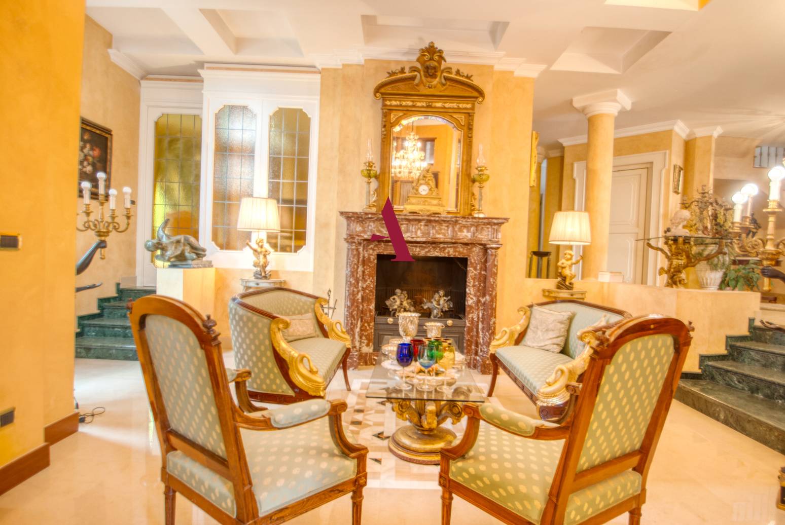 Entrando al piano principale della villa, si accolti da un ampio ingresso che conduce a un salone luminoso con camino, un elemento che crea un'atmosfera calda e invitante.
