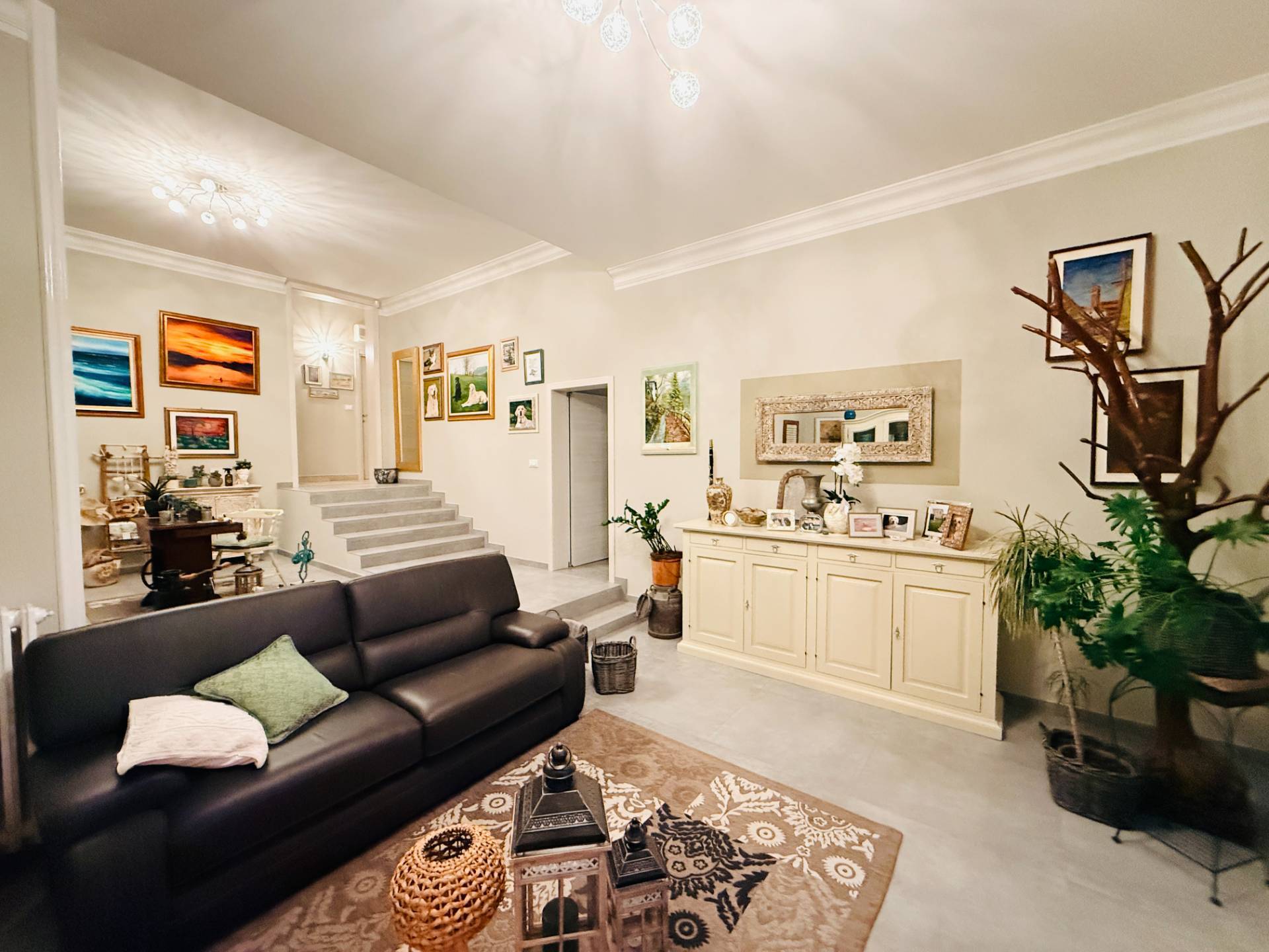 Si compone al Piano Rialzato da Ingresso, Soggiorno ampio e luminoso con affaccio sul Giardino, Cucina di Abitabile di circa 30 mq. con affaccio sul Giardino, disimpegno, 3 Camere da Letto e Bagno: al Piano Terra da Taverna, 2 ampie Cantine, Zona Stenditoio e Bagno.