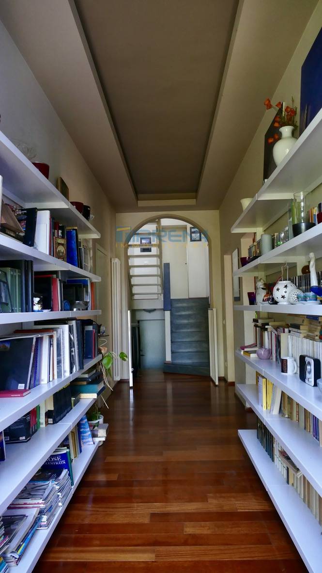 Dal corridoio, scendendo, si accede tramite 5 scalini ad un ampio locale a piano terra (con porta-finestra e due finestre) di altezza 2,20, attualmente suddiviso in studio e stanza armadi.