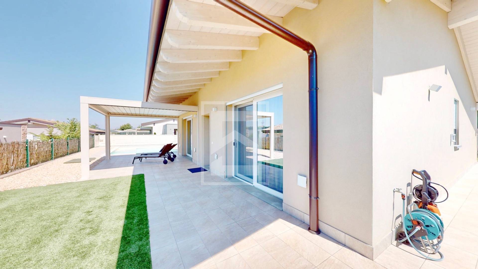 Proponiamo elegante villa singola in stato impeccabile e disposta completamente al piano terra compreso il garage doppio, garantendo una comodit senza pari, immersa in un curatissimo giardino su 4 lati dotato di irrigazione automatica, luci notturne, una capiente piscina e una biopergola elettrica.