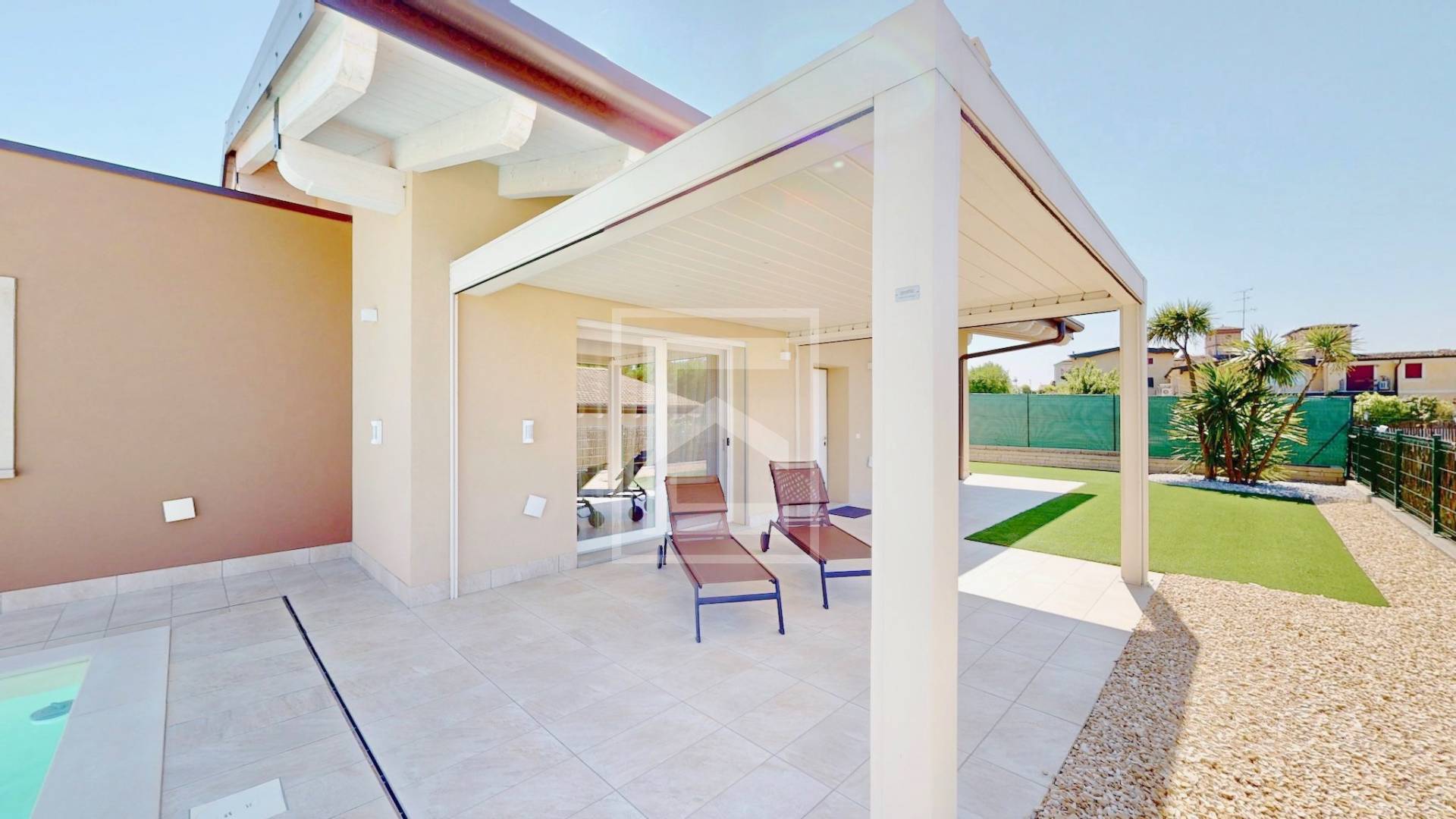 Proponiamo elegante villa singola in stato impeccabile e disposta completamente al piano terra compreso il garage doppio, garantendo una comodit senza pari, immersa in un curatissimo giardino su 4 lati dotato di irrigazione automatica, luci notturne, una capiente piscina e una biopergola elettrica.