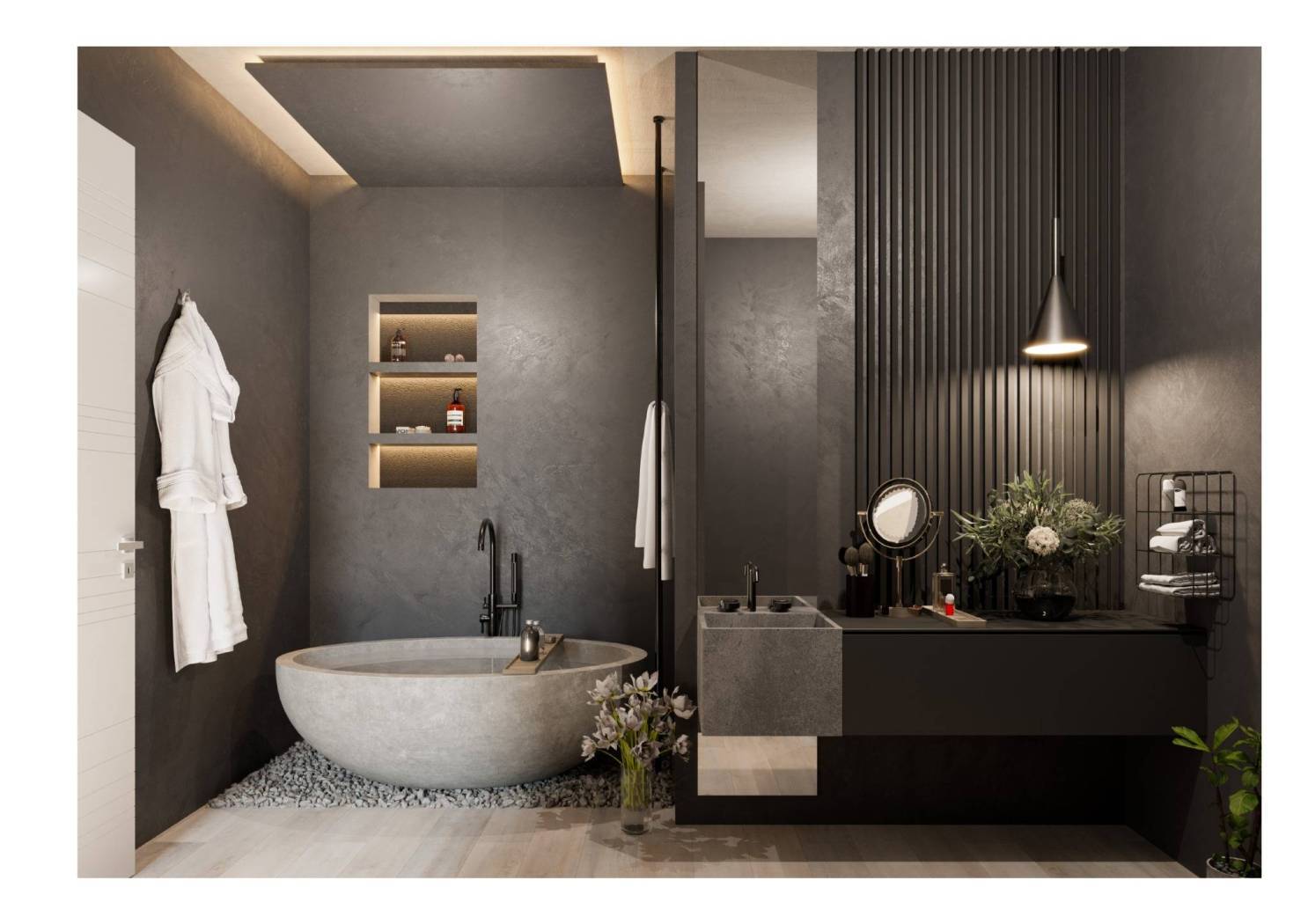 Un disimpegno conduce alla zona notte composta da tre camere da letto e due bagni, entrambi completi e curati nelle finiture, pensati per rendere fluida la vita quotidiana.