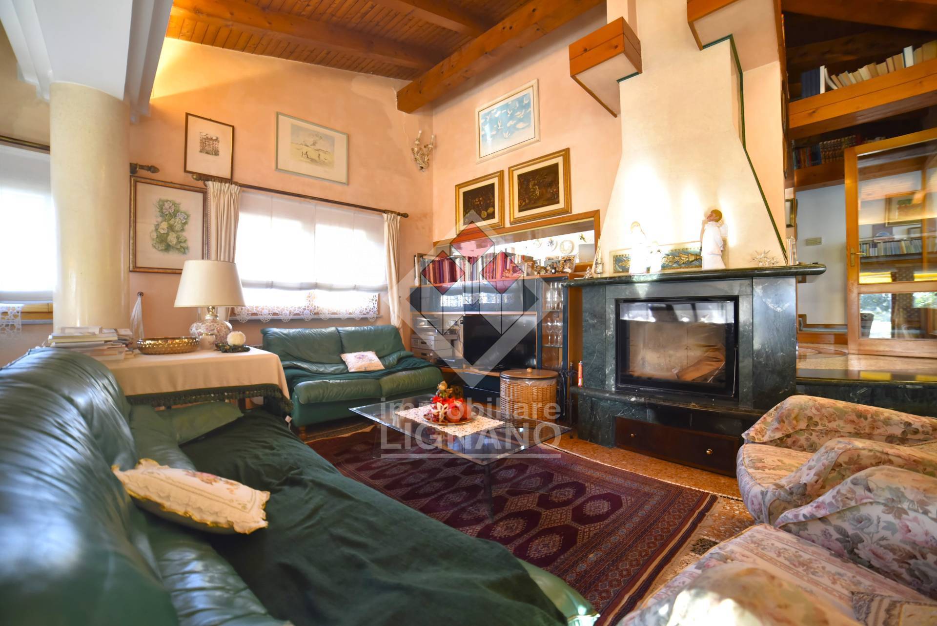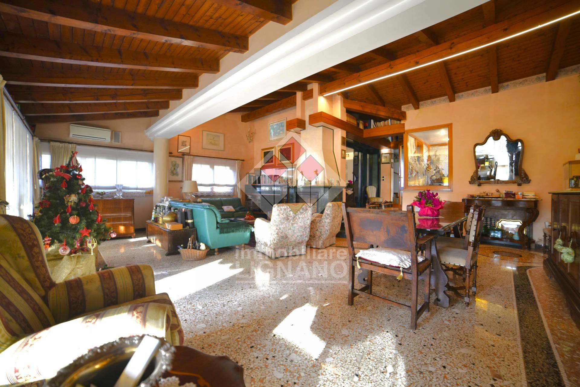 Gli spazi interni sono ampi e ben distribuiti, con un totale di 10 locali tra cui soggiorno, sala da pranzo, cucina abitabile e tre camere da letto e tre bagni pi uno studiolo mansardato con travi in legno a vista, all'occorrenza utilizzabile come camera per eventuali ospiti.