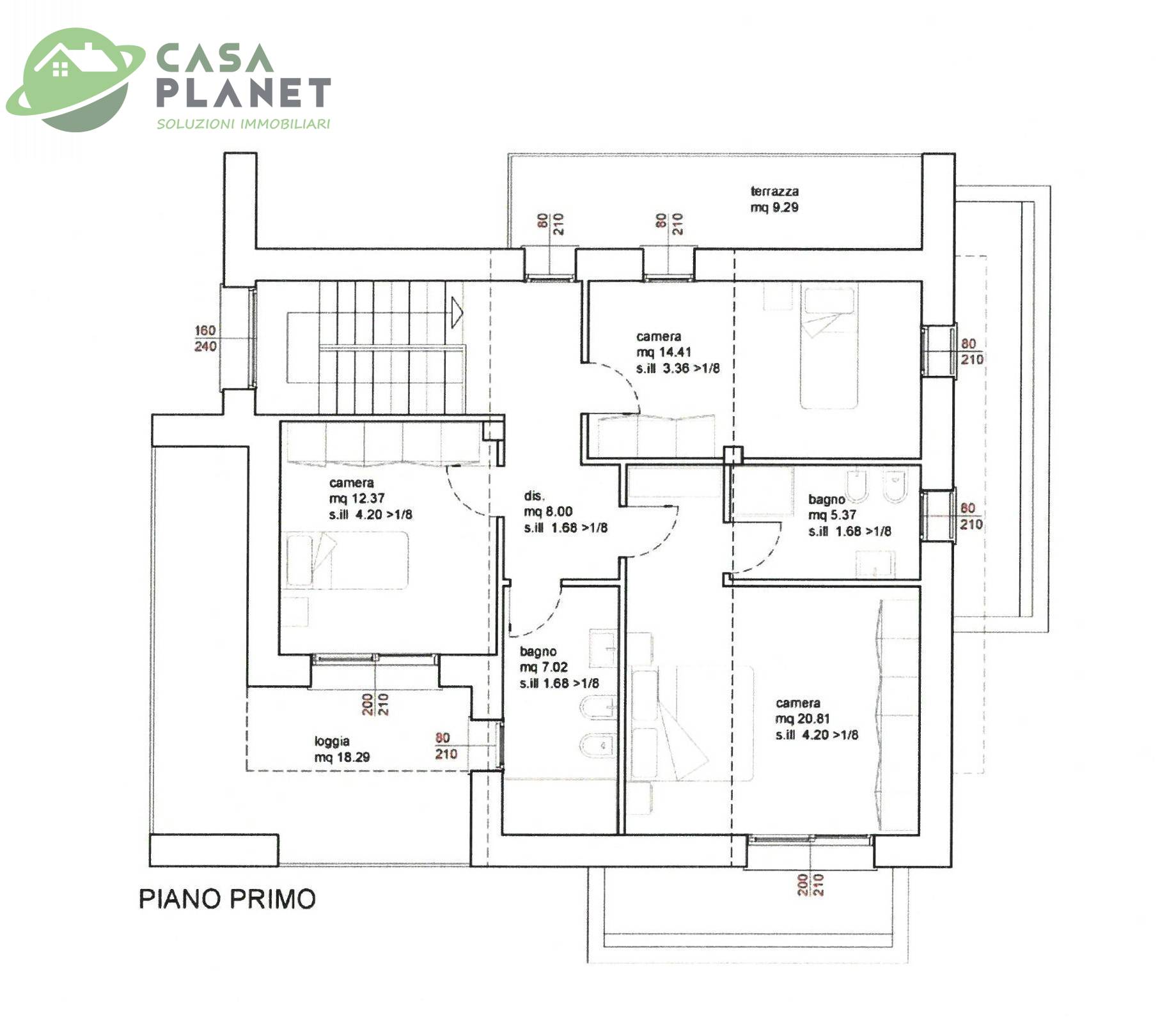 Una comoda scala in muratura porta al primo piano dove troviamo due ampi bagni, due camere singole di oltre 12 mq. dalle quali si accede ad un terrazzo, una camera matrimoniale di 20 mq. con terrazzo.