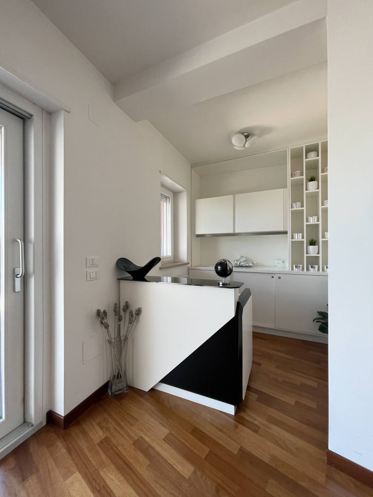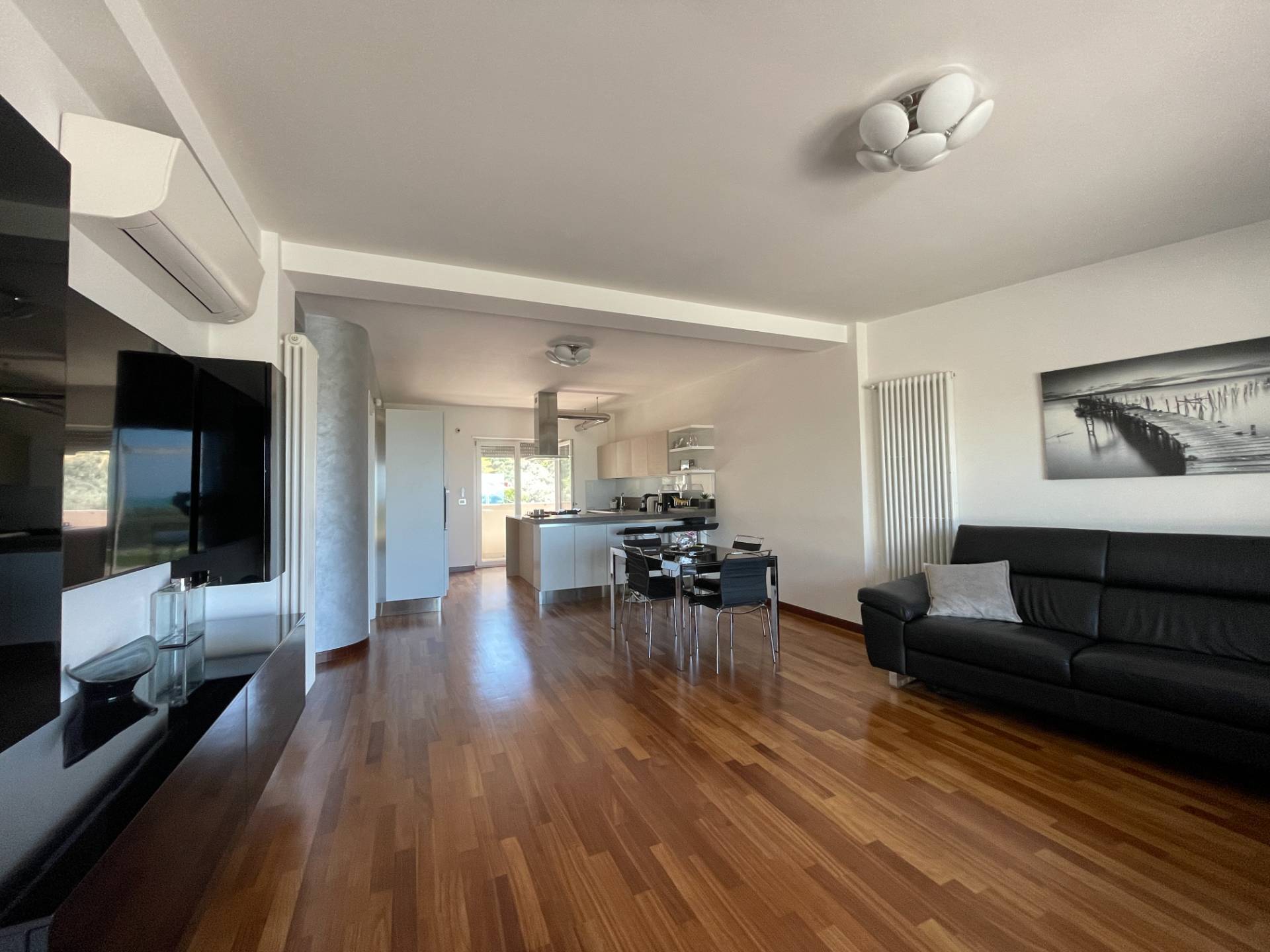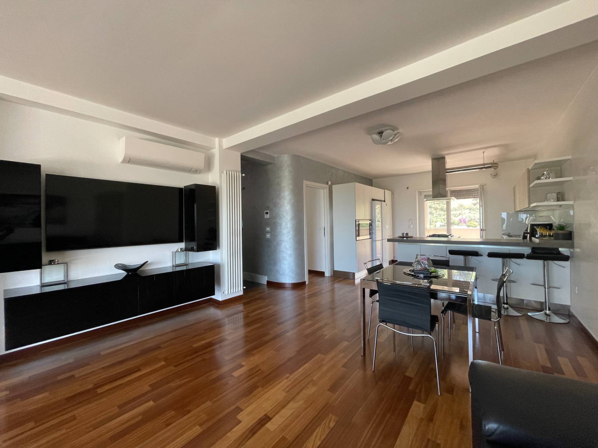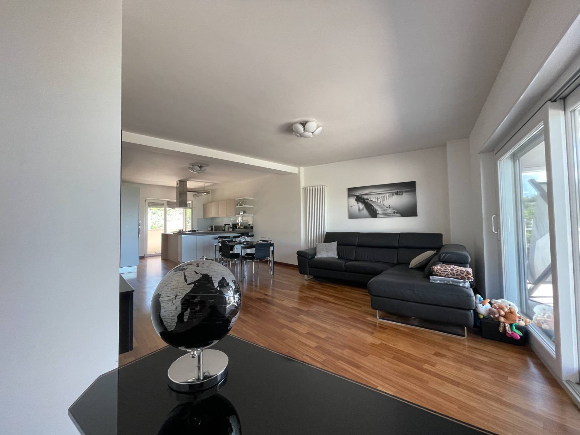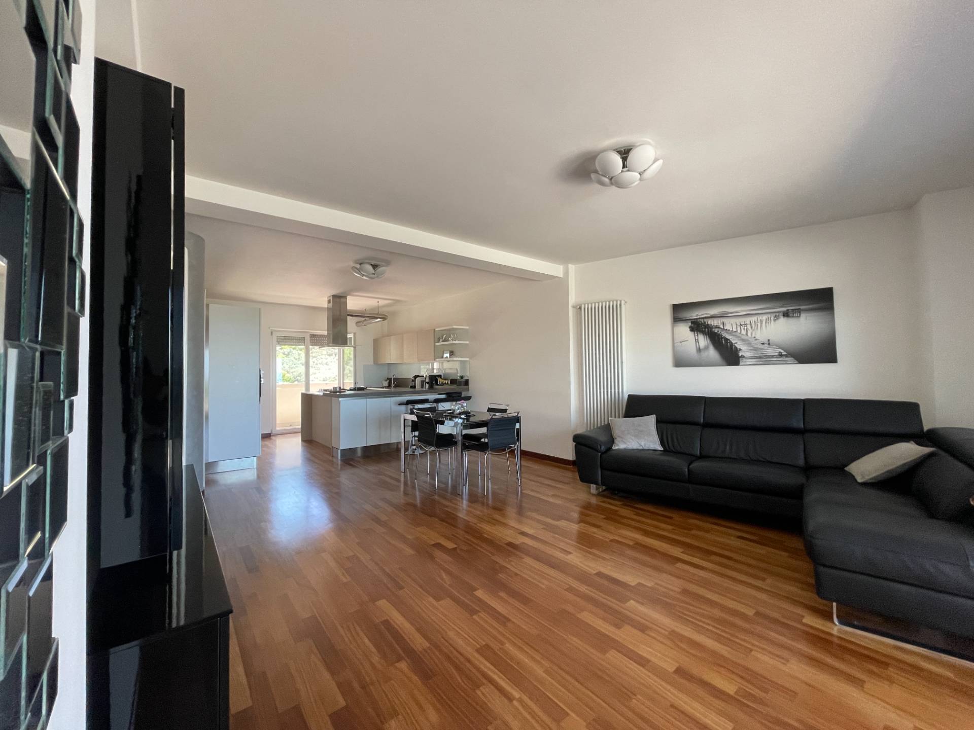 Il soggiorno ha una doppia esposizione, verso sud/ovest con balcone dotato di tenda parasole automatica e verso nord/est che tramite ampio finestrone scorrevole permette di accedere allo spazio esterno, in parte pavimentato e coperto da veranda automatizzata ed in parte a giardino con sistema di irrigazione automatizzato.