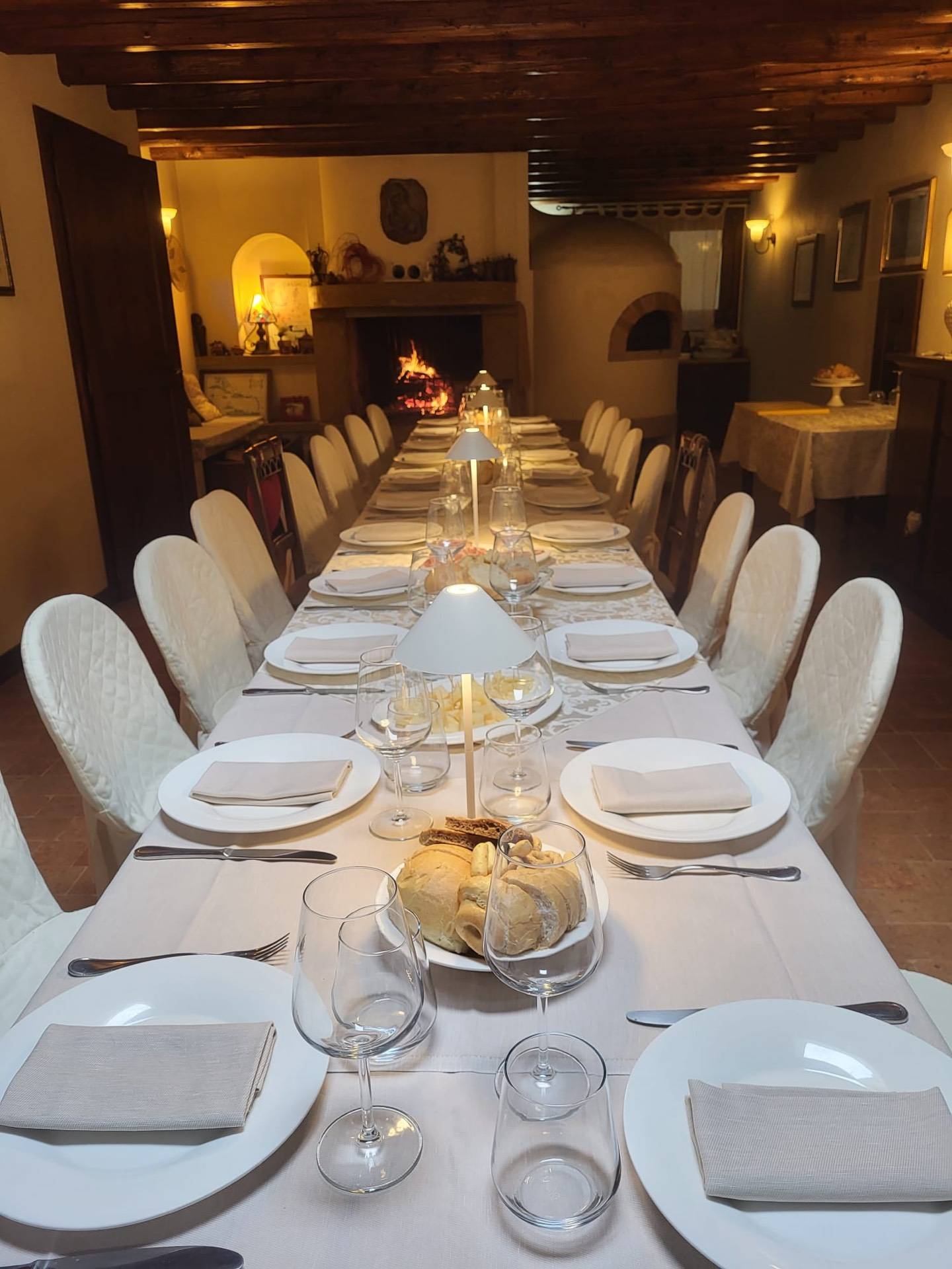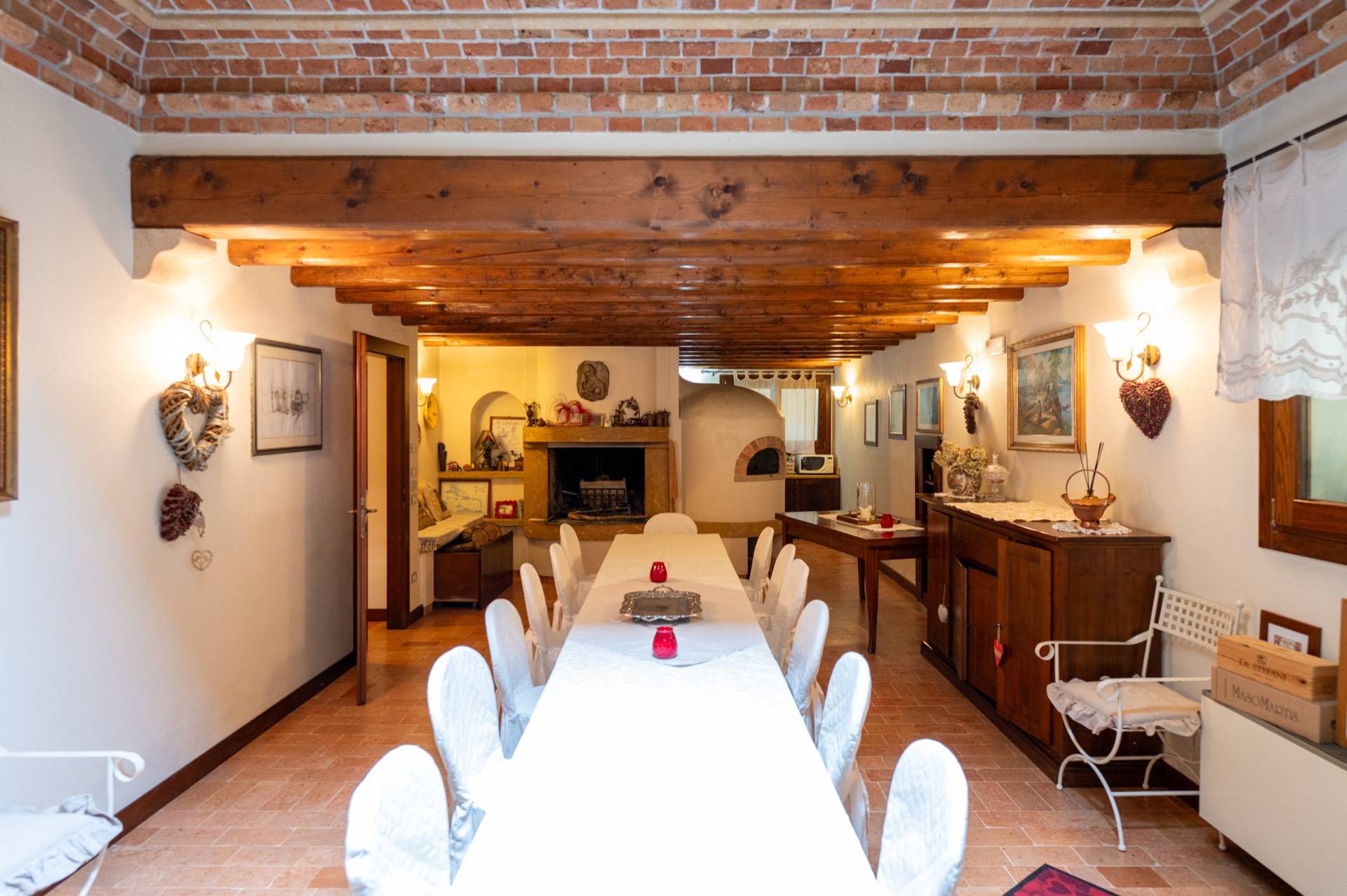 Dalla veranda, entriamo nell'ingresso principale dell'abitazione, dove troviamo una magnifica sala da pranzo di 60 mq, suddivisa in vari angoli priv dove la propriet l'ha arredata con diversi tavoli di varie dimensioni, creando cos un' atmosfera piacevole e riservata; da qui si accede direttamente al portico principale adibito a pranzi e cene. Dalla sala pranzo con porte scorrevoli si entra in un altro soggiorno di 28 mq sempre arredato con grande stile, comunicante con la cucina abitabile con mobilio e elettrodomestici professionali in inox, adiacente c' un' altra stanza con caminetto per cucinare il pane e la pizza e anche da qui si accede all'esterno con un altro portico sempre con la possibilit di potersi sedere fuori.