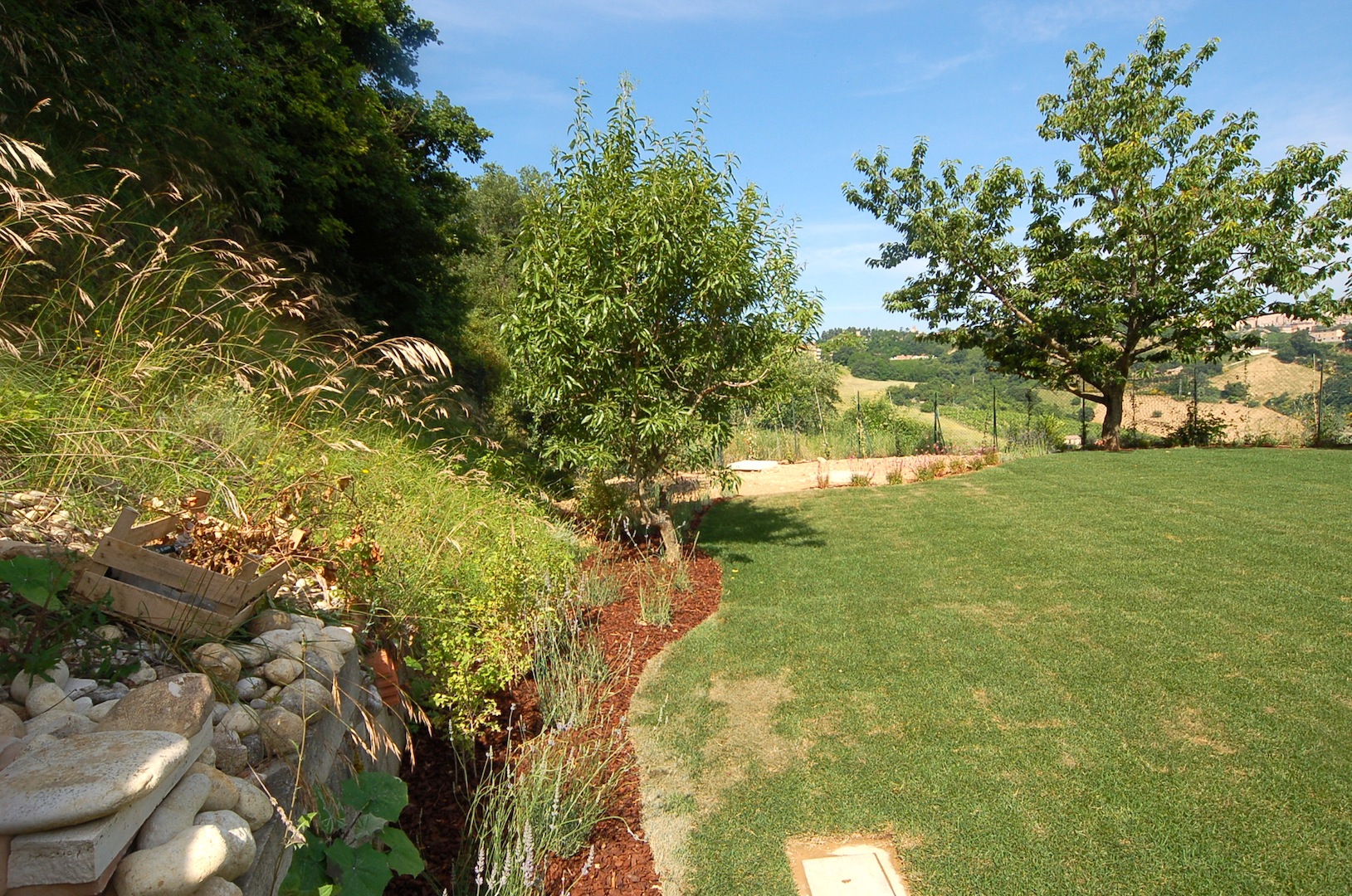 Il villino circondato da un giardino recintato di 3.500 mq. circa, allestito in gran parte a prato, fornito di impianto d'irrigazione con cisterna interrata di raccolta delle acque meteoriche, parcheggio privato per 2/3 autovetture, 2 rimesse attrezzi in legno, ampio porticato di 40 mq. circa antistante la zona giorno (condonato e quindi chiudibile). Parzialmente restaurato internamente e completamente esternamente, il villino ubicato in aperta campagna ma a meno di 1 Km. dal paese.