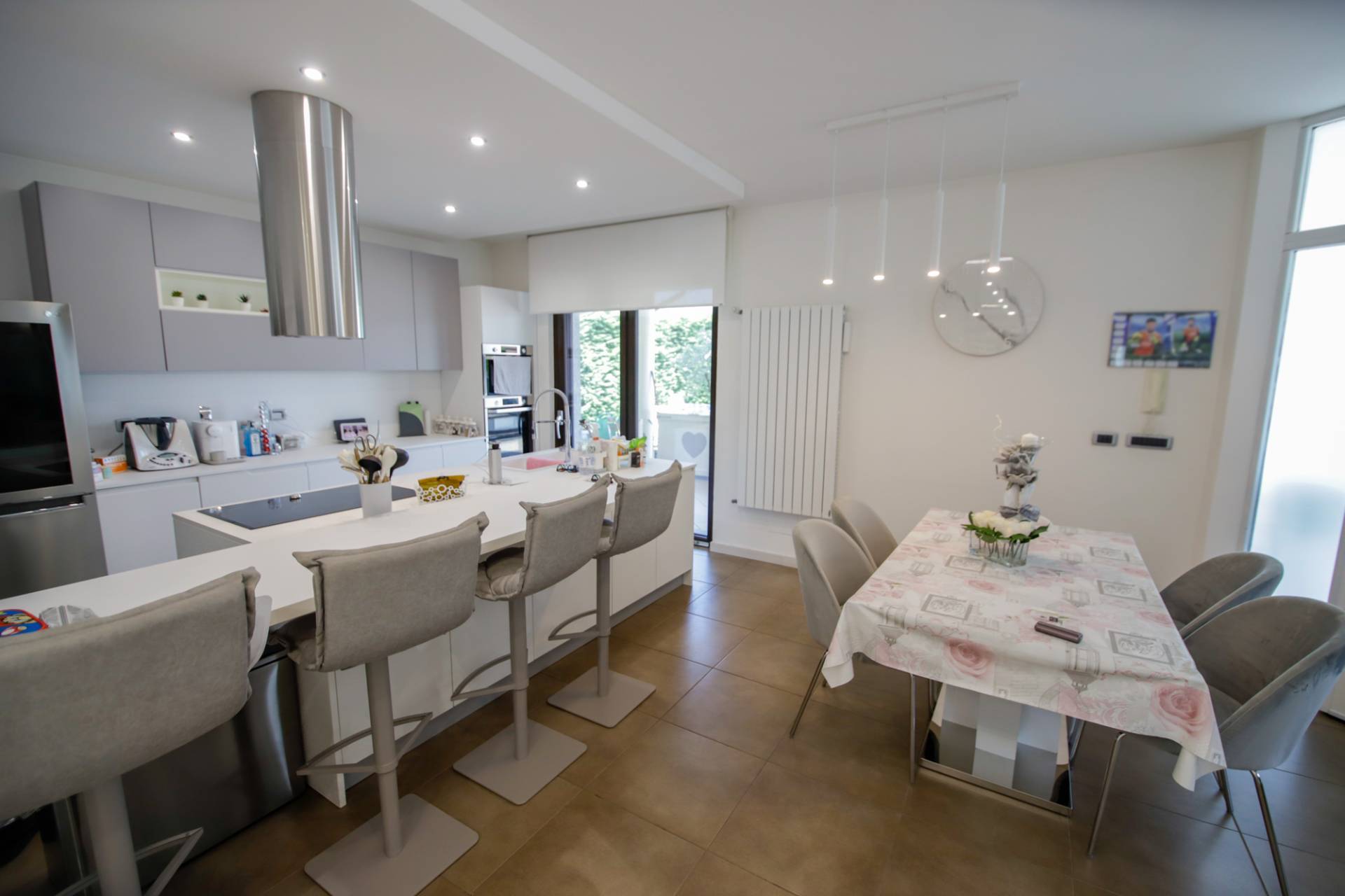 L'abitazione disposta principalmente su due livelli, ciascuno di circa 100m ; al piano rialzato la zona giorno, caratterizzata dagli spazi generosi, ma soprattutto dalle ampie vetrate che rendono l'esterno parte integrante con gli interni: particolarmente suggestiva la vetrata del soggiorno, con affaccio diretto sulla piscina.