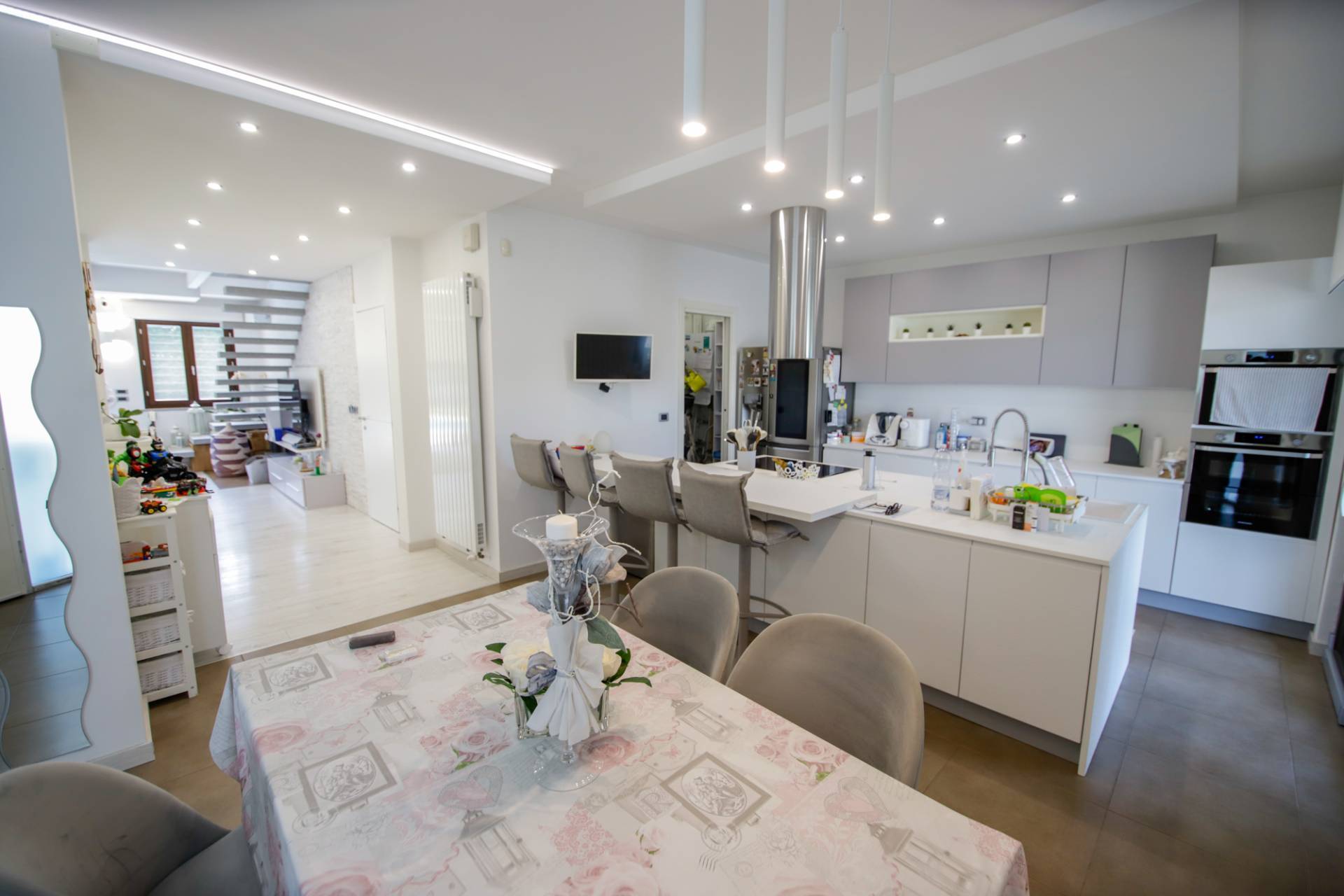 L'abitazione disposta principalmente su due livelli, ciascuno di circa 100m ; al piano rialzato la zona giorno, caratterizzata dagli spazi generosi, ma soprattutto dalle ampie vetrate che rendono l'esterno parte integrante con gli interni: particolarmente suggestiva la vetrata del soggiorno, con affaccio diretto sulla piscina.