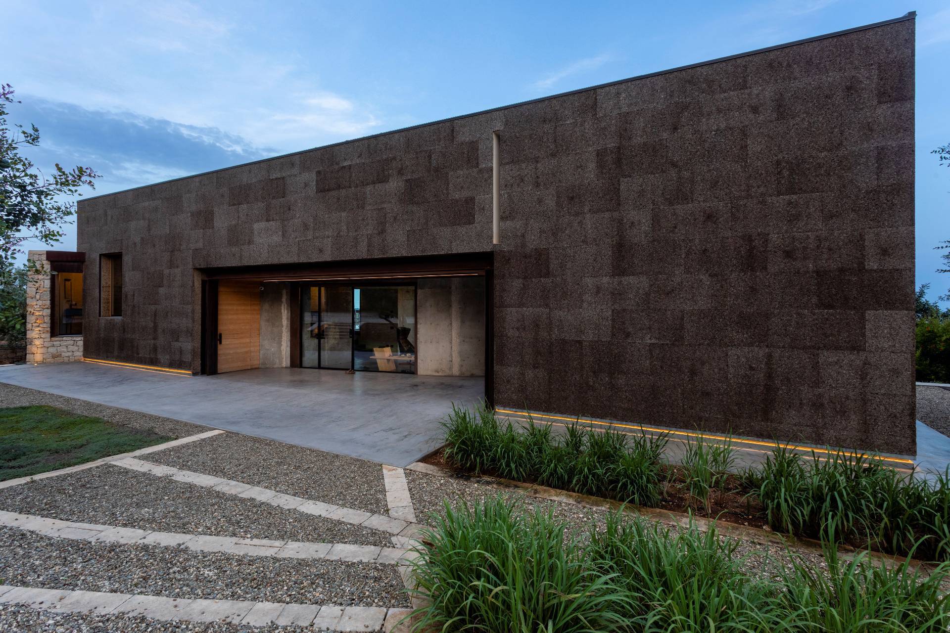 Esternamente la casa rivestita in sughero che, oltre a donare alla villa un aspetto caldo e una texture simile a quelle delle cortecce degli alberi, migliora lefficienza energetica e favorisce unintegrazione armoniosa con il paesaggio.