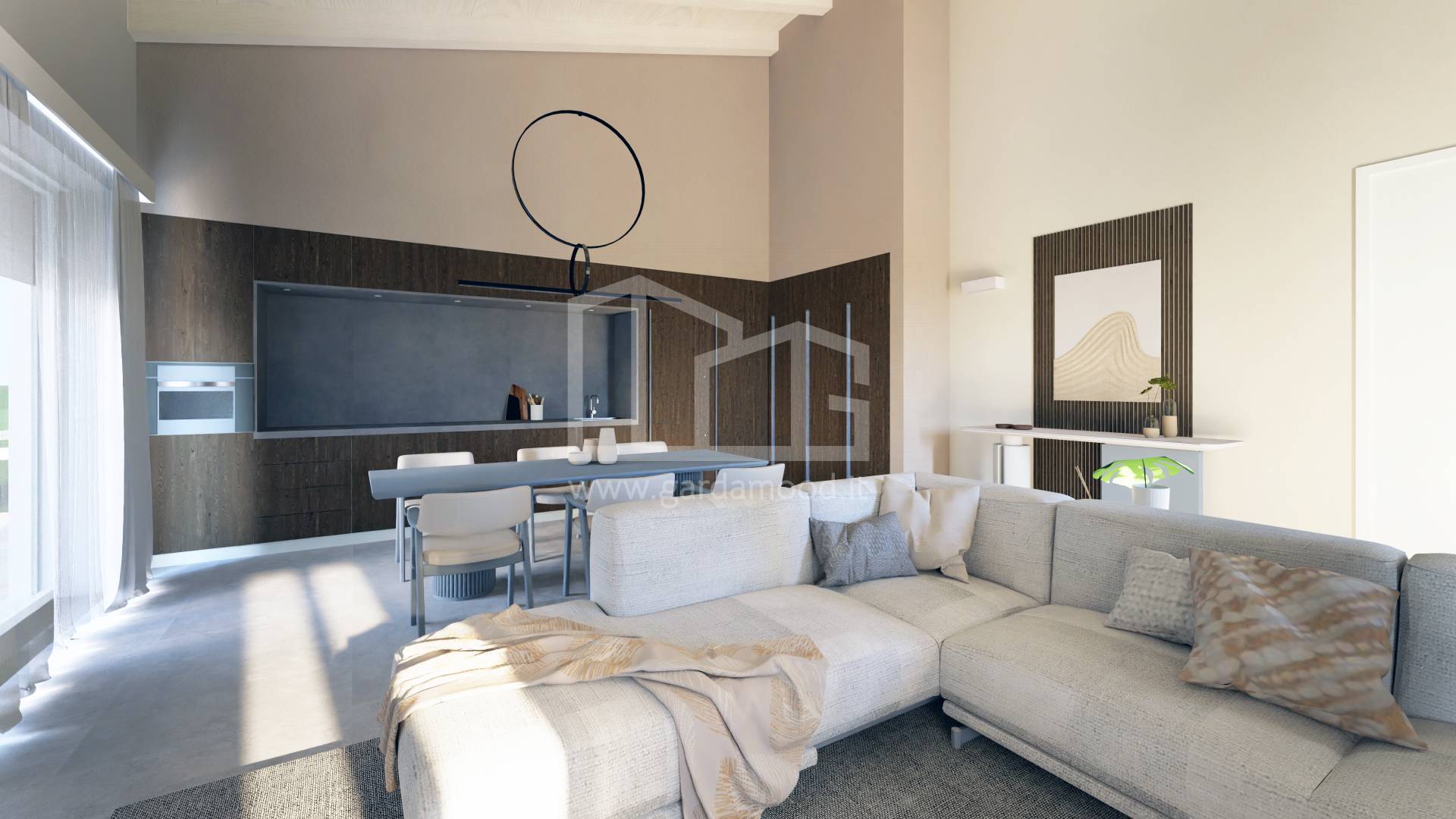 L'immobile viene edificato su un unico piano piano da 116 mq calpestabili, distribuiti in 4 ampi locali ed internamente composto da: ingresso su zona soggiorno con cucina a vista in open-space di 40 mq totali; 3 spaziose camere da letto e 2 bagni con doccia, di cui uno con attacchi lavanderia.