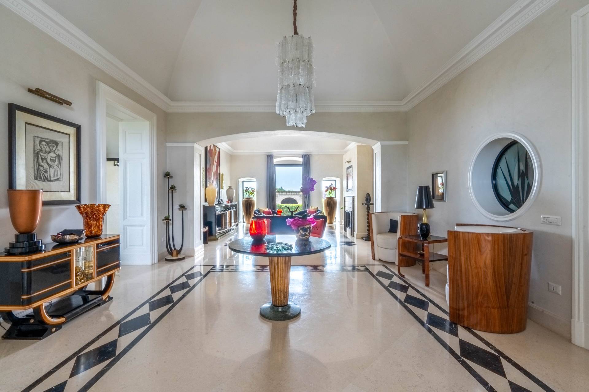 Al piano rialzato si trovano una zona living luminosa, un ampio salone con camino, una cucina abitabile, una zona pranzo e uno studio nel torrione.