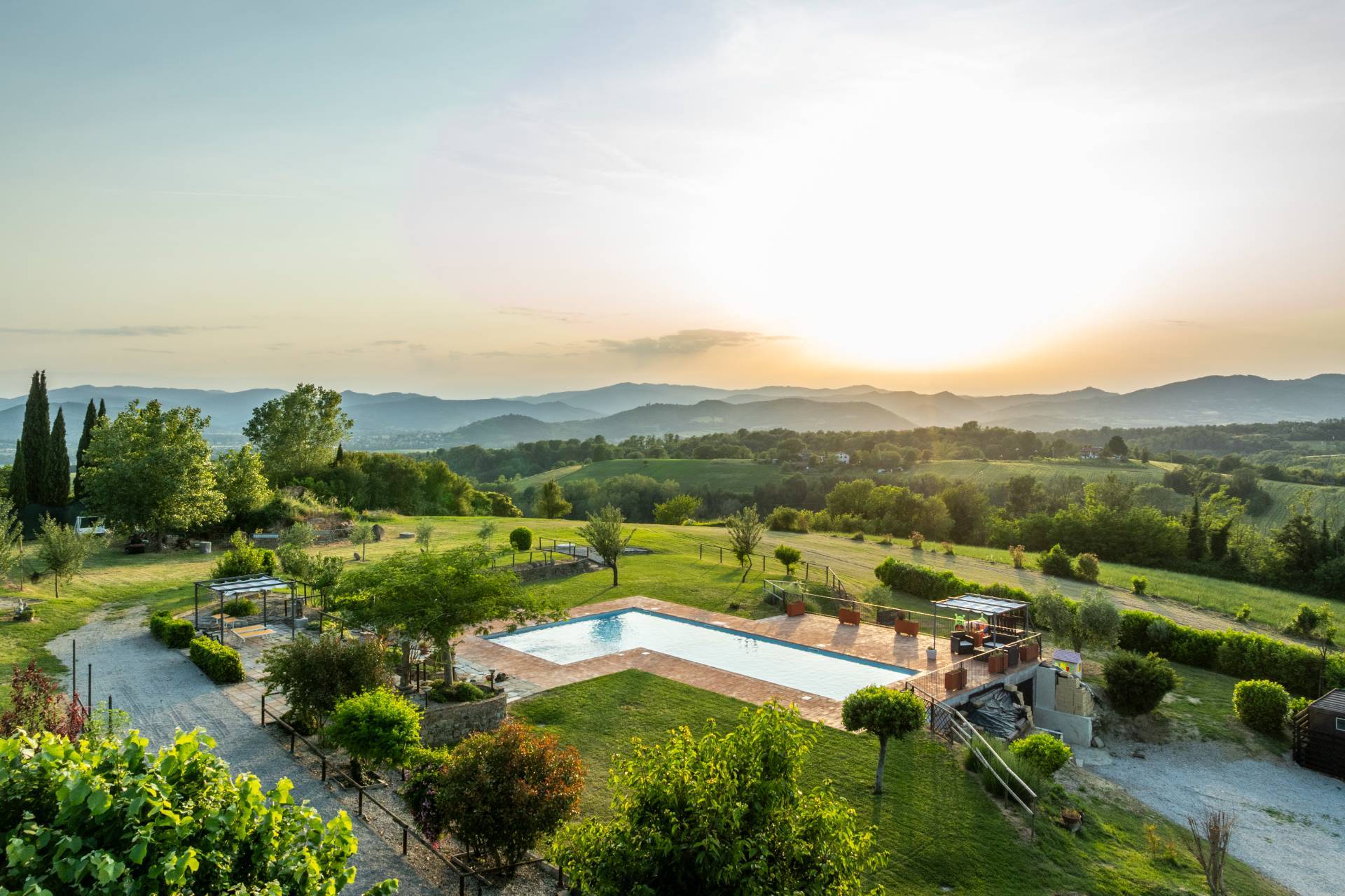 La posizione elevata della villa garantisce una vista libera e dominante sulle colline umbre che la avvolgono, in un contesto di assoluta quiete e privacy.