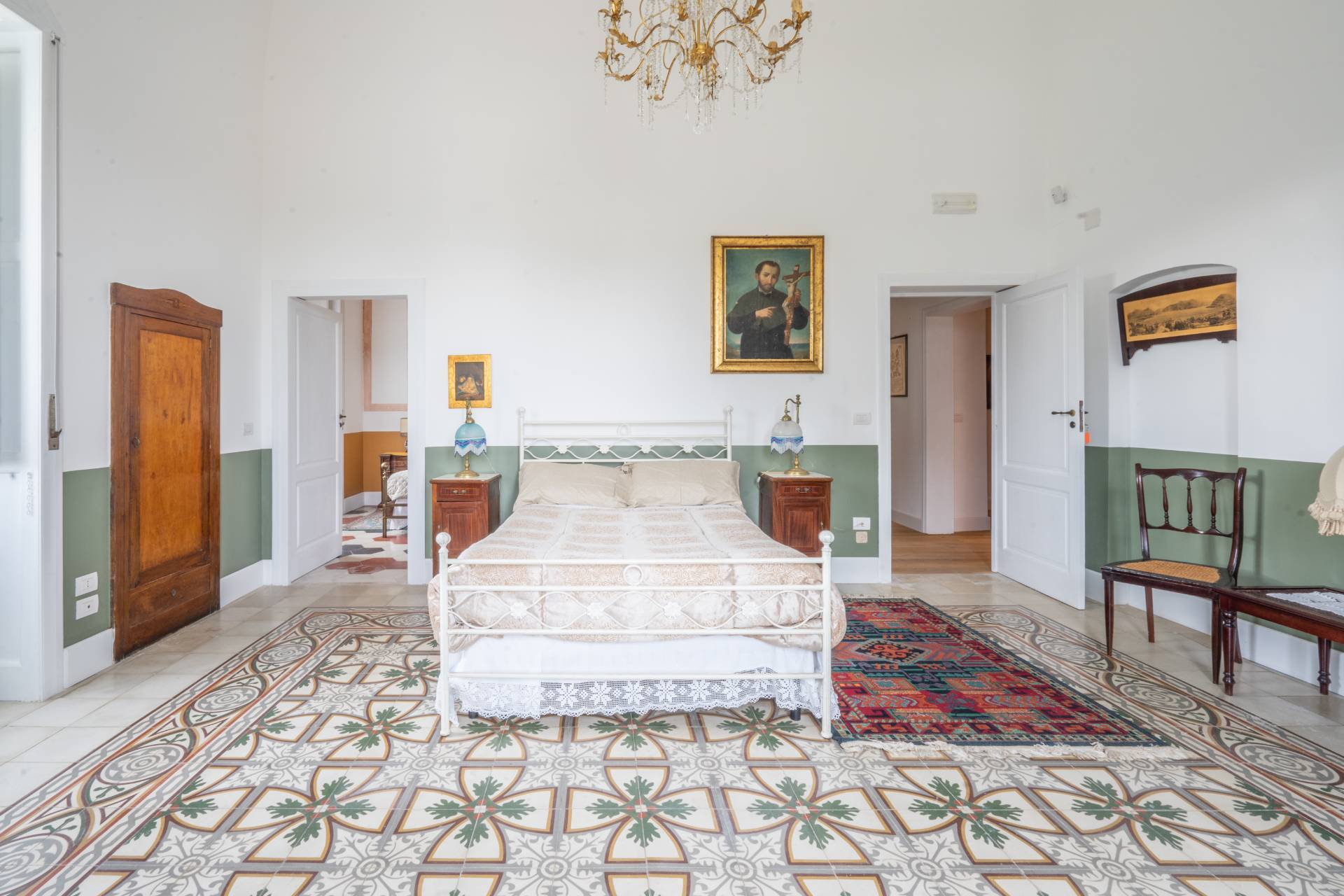 Percorrendo il viale alberato d'ingresso, l'accesso alla dimora facilitato da una progettazione attenta all'abbattimento delle barriere architettoniche attraverso rampe a norma, conducendo gli ospiti direttamente nel raffinato salone affrescato, vero cuore pulsante e rappresentativo della casa. Al piano rialzato, la zona notte accoglie quattro camere da letto, alcune delle quali impreziosite da affreschi originali sapientemente conservati, servite da tre bagni.