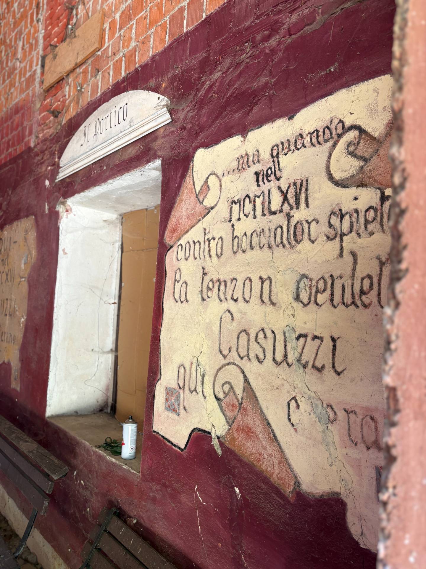Una scala a doppia rampa affrescata conduce alle stanze del primo piano e alla torretta.
