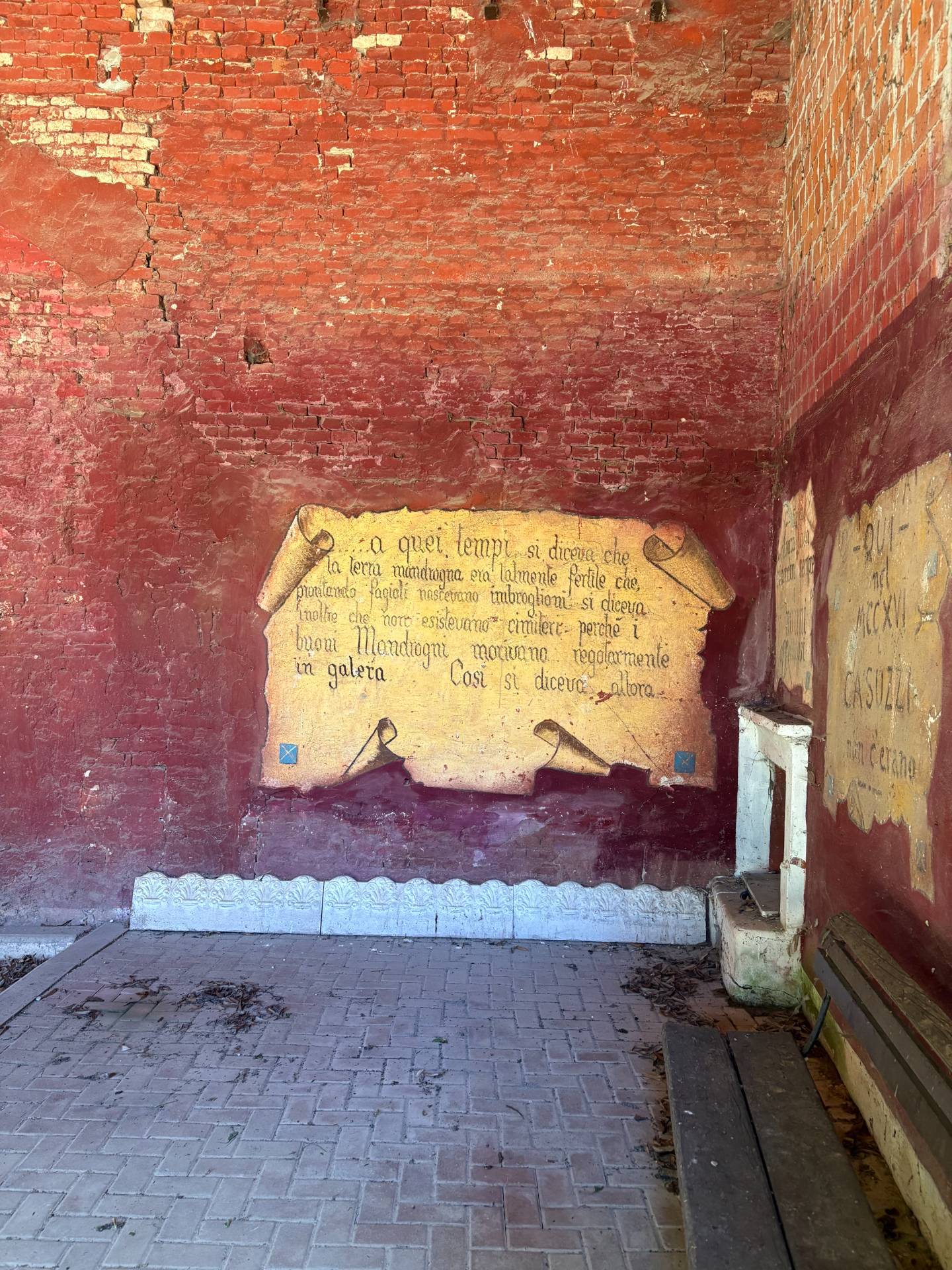 Di fronte alla casa, il giardino conduce ad un importante porticato in mattoni con 4 aperture ad arco, a doppia altezza che funge da salone estivo con particolari citazioni scritte sul muro di fondo.