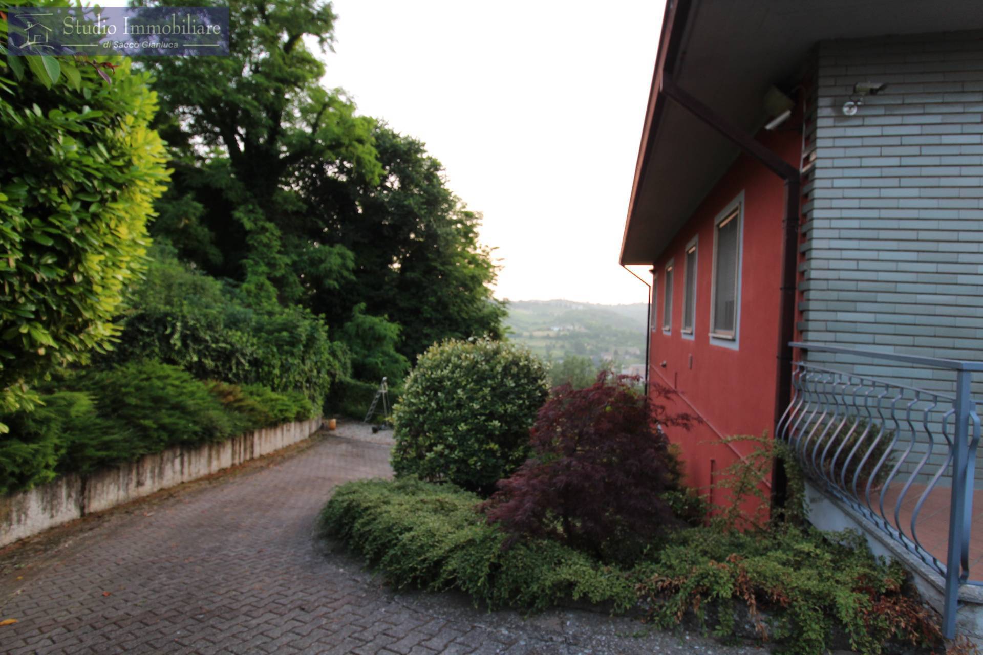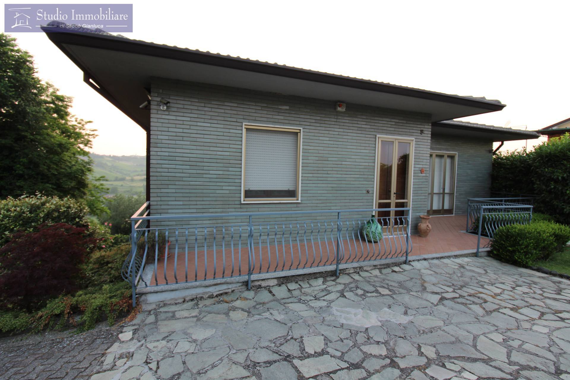 Villa singola disposta su unico piano in vendita nella prima fascia collinare di Stradella con vista panoramica, costituita al piano terra da ingresso, soggiorno, sala pranzo, cucina, disimpegno, due camere da letto matrimoniali, bagno e balcone con sottostante unautorimessa quadrupla e locale centrale termica.