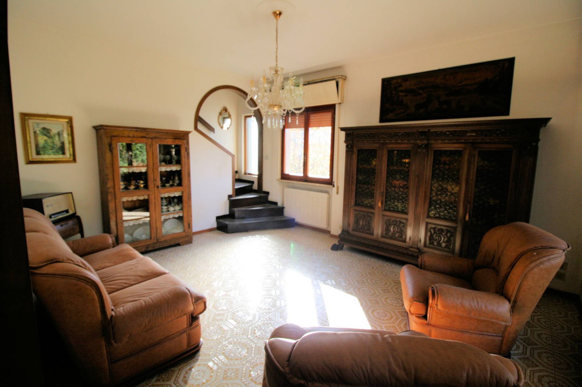 Al piano terra rialzato di circa 110 mq trovano spazio disimpegno, ampio soggiorno con accesso diretto ad un terrazzo, sala da pranzo con accesso diretto al giardino, cucinotto, disimpegno zona notte dove troviamo due camere e il bagno; Il piano primo di circa 80 mq, raggiungibile attraverso una scala posta nel soggiorno, composto da un soggiorno molto luminoso con camino e accesso diretto alla grande terrazza che circonda tre lati del piano, cucina con accesso alla terrazza, camera con accesso alla terrazza, ***.*******.** piano della villa stato utilizzato come appartamento indipendente dal piano terra ma il futuro acquirente potr decidere se utilizzarlo cos o destinarlo a zona ***.*******.** terrazza ha una parte coperta dalla falda del tetto; Il piano seminterrato di circa 110 mq con altezza di 2,10 metri, raggiungibile sia dallinterno che dalla porta del garage, si compone di autorimessa, dispensa, cantina, locale di sgombero, locale caldaia, wc, bagno/lavanderia.