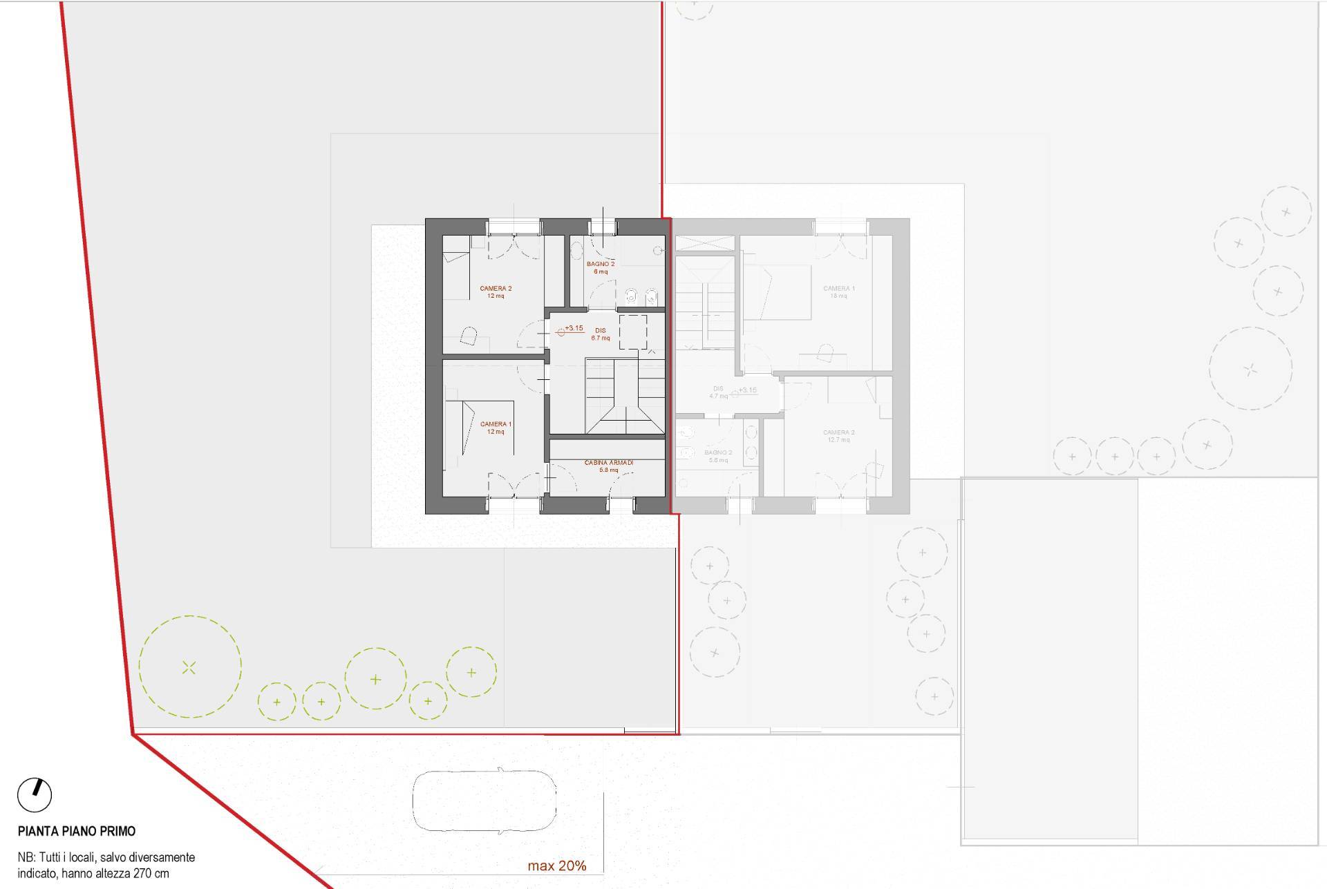 Collegato tramite scala interna, il primo piano composto da una camera da letto matrimoniale con cabina armadio e accesso privato a un terrazzo di 15 mq, una camera da letto doppia/uso singolo e un bagno.