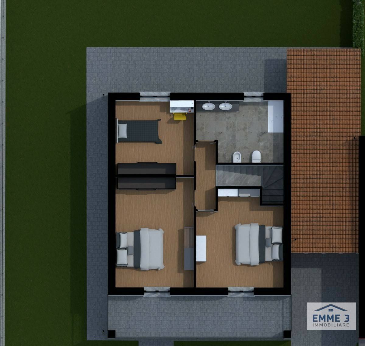 Al primo piano da tre camere da letto di cui due camere con accesso al terrazzo coperto, disimpegno e un ampio bagno.