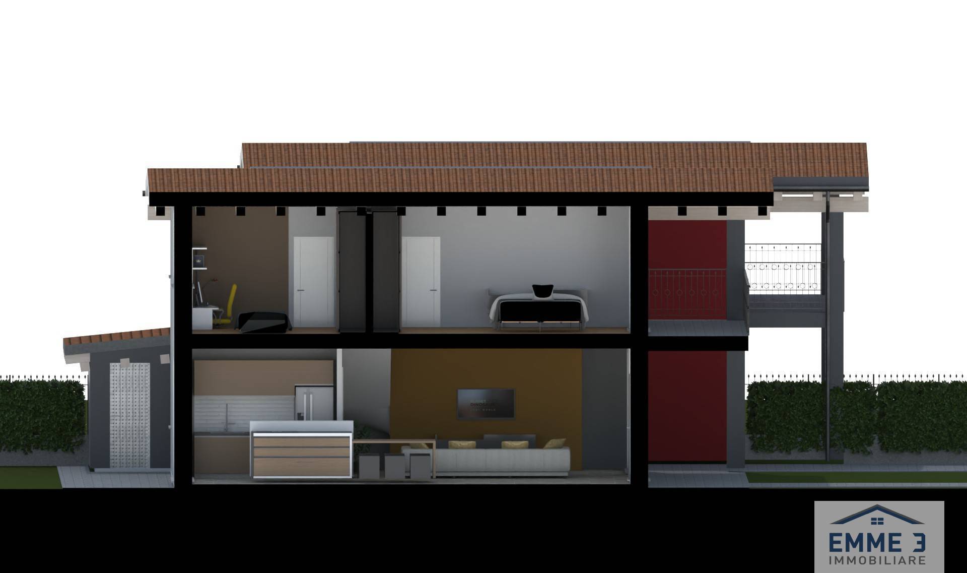 L'immobile si sviluppa su due livelli con una superficie di 162 mq, oltre il portico al piano terra e terrazzo al primo piano, il piano terra composto da: ingresso, sala, cucina, antibagno/lavanderia e bagno, centrale termica, garage e giardino esclusivo di ampia metratura.