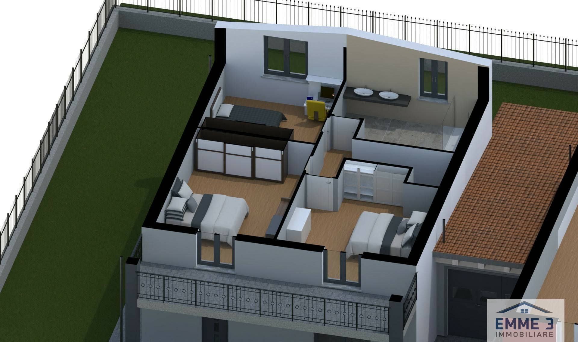 Al primo piano da tre camere da letto di cui due camere con accesso al terrazzo coperto, disimpegno e un ampio bagno.