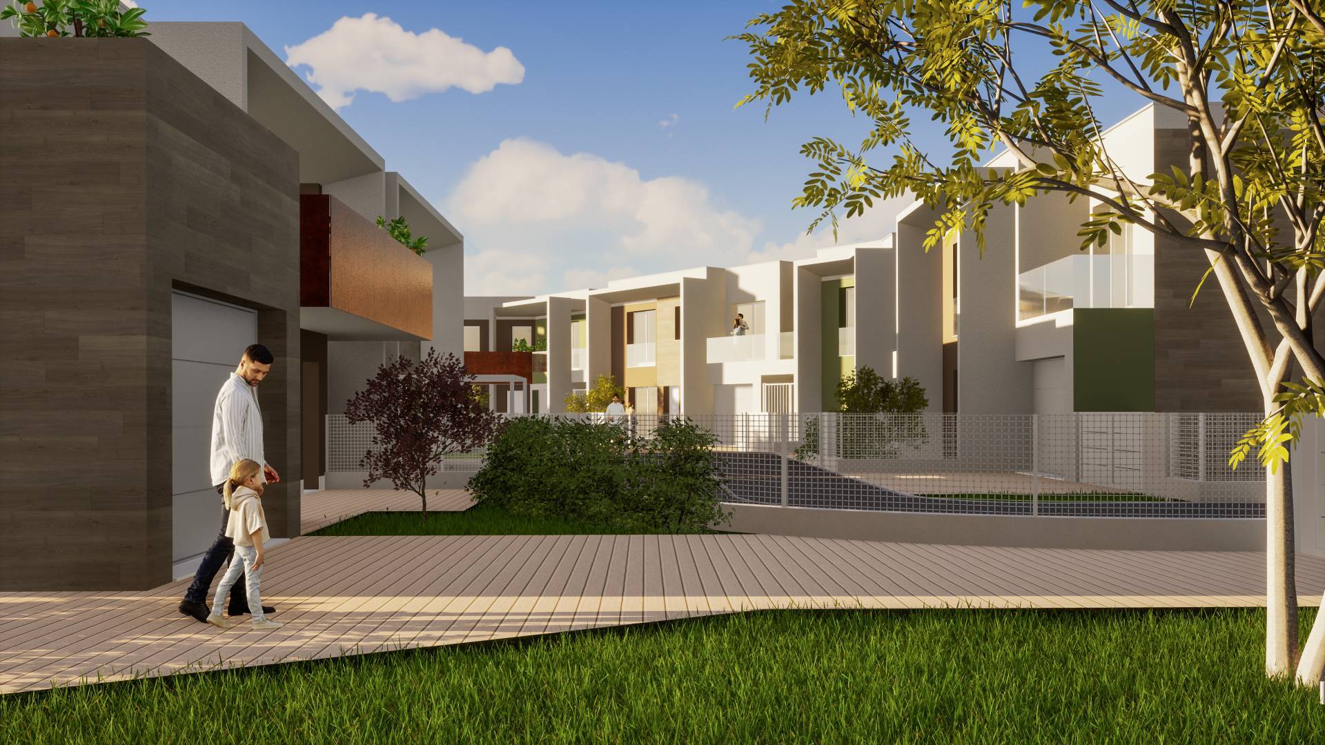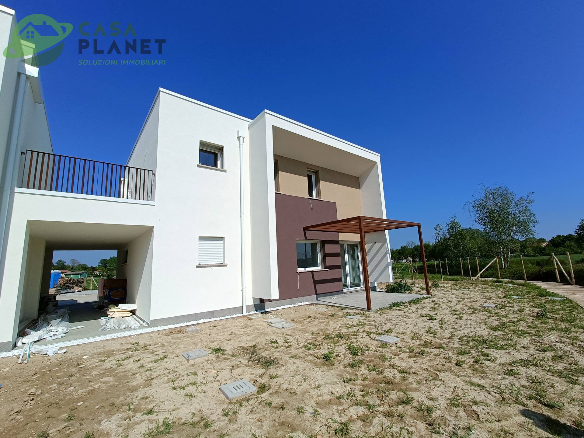 Soggiorno con cucina a vista di 51 mq., bagno, garage di 17 mq., pergolato di 12 mq., portico di 25 mq. al piano terra con scoperto pertinenziale di circa 240 mq. Al piano primo tre camere, due matrimoniali di cui una con bagno in camera, ed una doppia, altro bagno, bella terrazza di oltre 28 mq., in classe energetica A4. Con riscaldamento a pavimento, fotovoltaico con pompa di calore, predisposizione aria condizionata in ogni stanza, VMC predisposta, allarme volumetrico e perimetrale predisposto, basculanti del garage motorizzati e montati a filo muro, ampie vetrate scorrevoli, tapparelle elettriche, zanzariere, cancello carrabile elettrico, pavimenti e rivestimenti a scelta, alto capitolato.