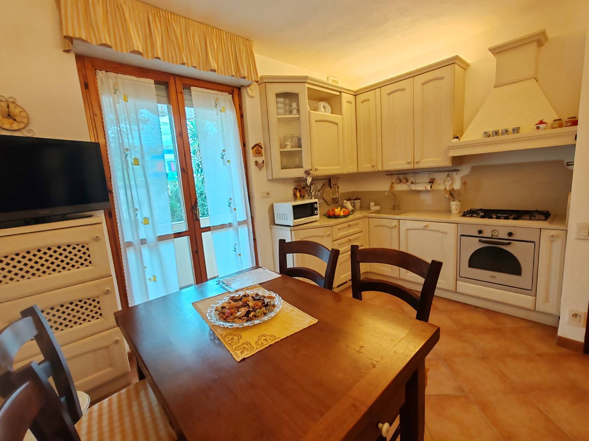 L'ingresso direttamente nell'ampio e luminoso soggiorno, scendendo 3 gradini raggiungiamo la cucina abitabile dalla quale si accede al balcone e al giardino di circa 66 mq posto sul retro, e il bagno di servizio con finestra.