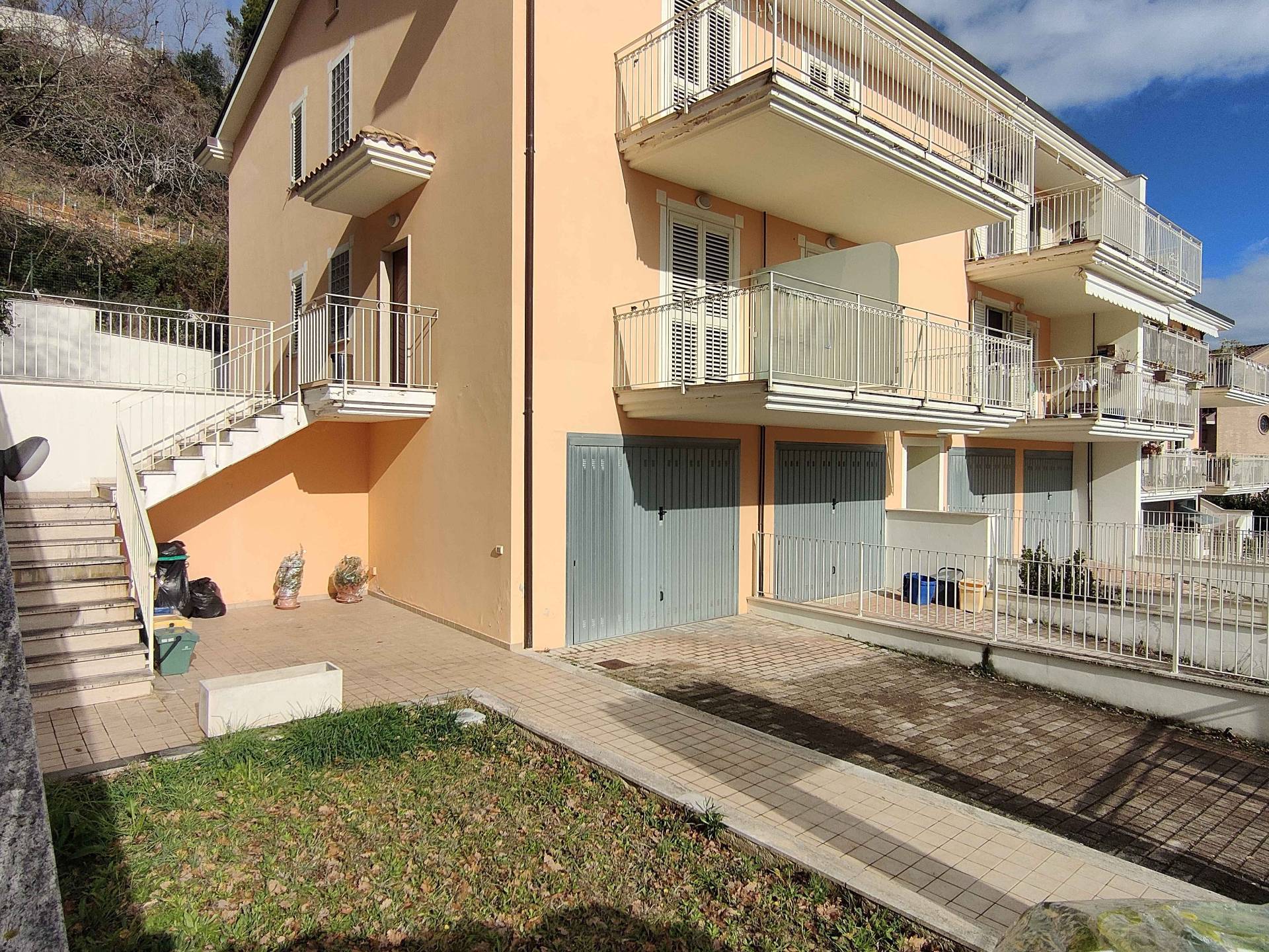 Villetta a schiera di testa in vendita ad Acquaviva Picena, in zona residenziale con vista mare, dislocata su tre livelli, delle dimensioni complessive di circa mq 194 coperti (compreso il garage di mq 52), oltre a circa mq 180 esterni (destinati a giardino, corti pavimentate, posti auto, scale, etc.) e circa mq 35 di terrazzi abitabili.