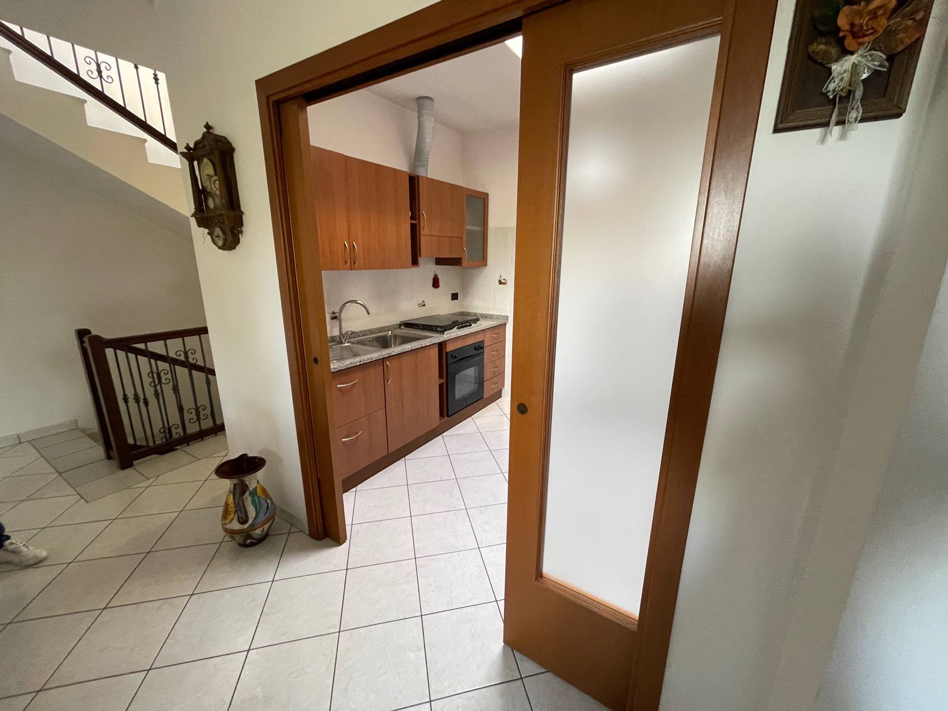 RIF. 8427 - SAN BENEDETTO DEL TRONTO, COLLINARE - Si propone in vendita villetta a schiera di complessivi mq 235 disposta su tre livelli e cos distribuita: piano seminterrato di mq 130 composto da garage di mq 65, rustico allo stato grezzo di mq 60 con canna fumaria per la realizzazione di un camino, bagno allo stato grezzo, mancano solo i rivestimenti e i sanitari; piano terra di mq 90 con ingresso indipendente da corte privata di 70 mq circa, in parte pavimentata e in parte a giardino, ampio soggiorno, cucina abitabile, su un livello diverso vi sono due camere matrimoniali e un bagno con box doccia; primo piano di mq 90 circa composto varie zone sottotetto da utilizzare come ripostiglio oltre un terrazzo di mq 10 circa.