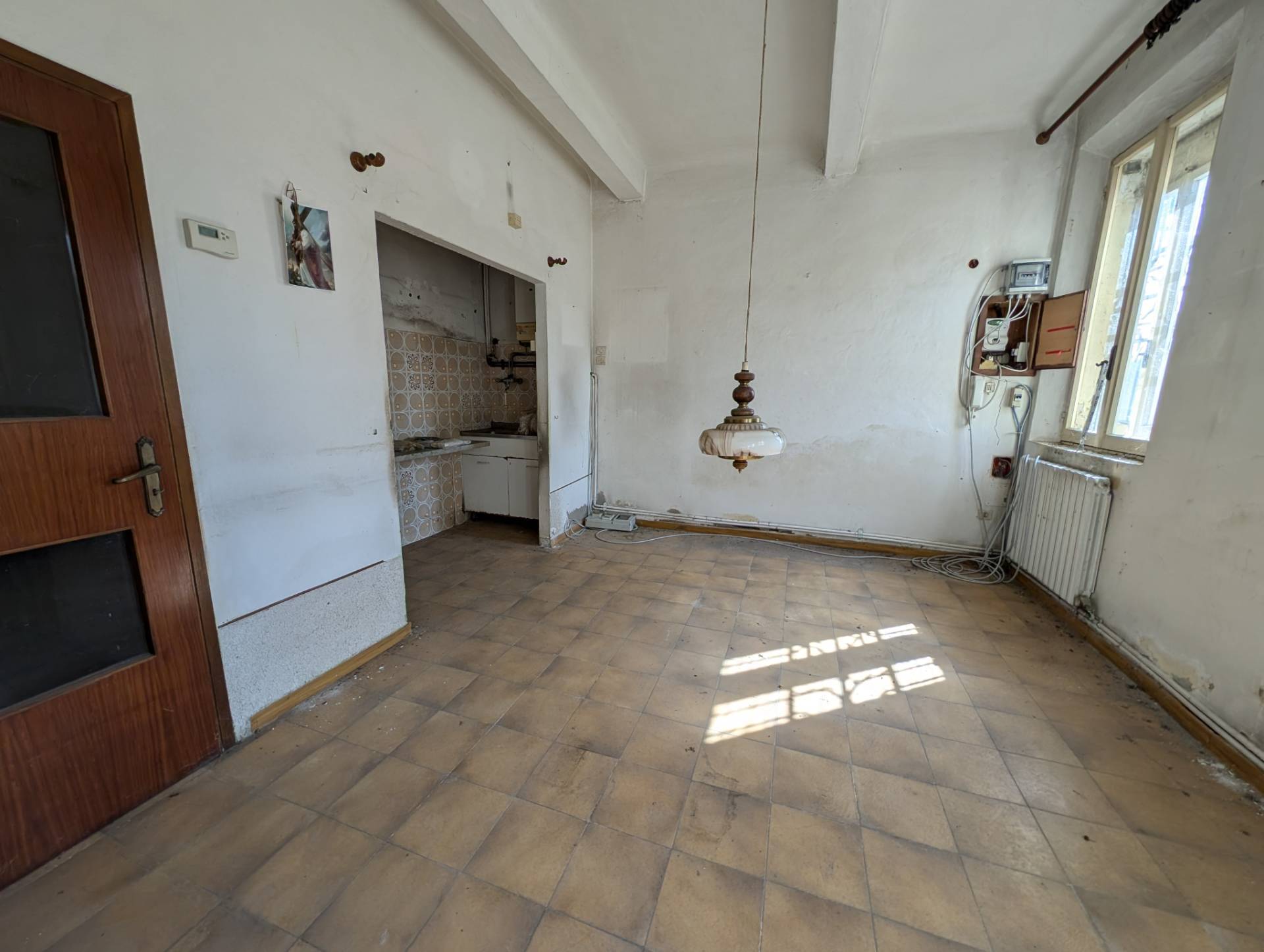 L'immobile, attualmente costituito da soggiorno, cucina, due letto e bagno, circondato da uno scoperto di circa 500 mq e completato da ampio magazzino/garage, anch'esso da ristrutturare.