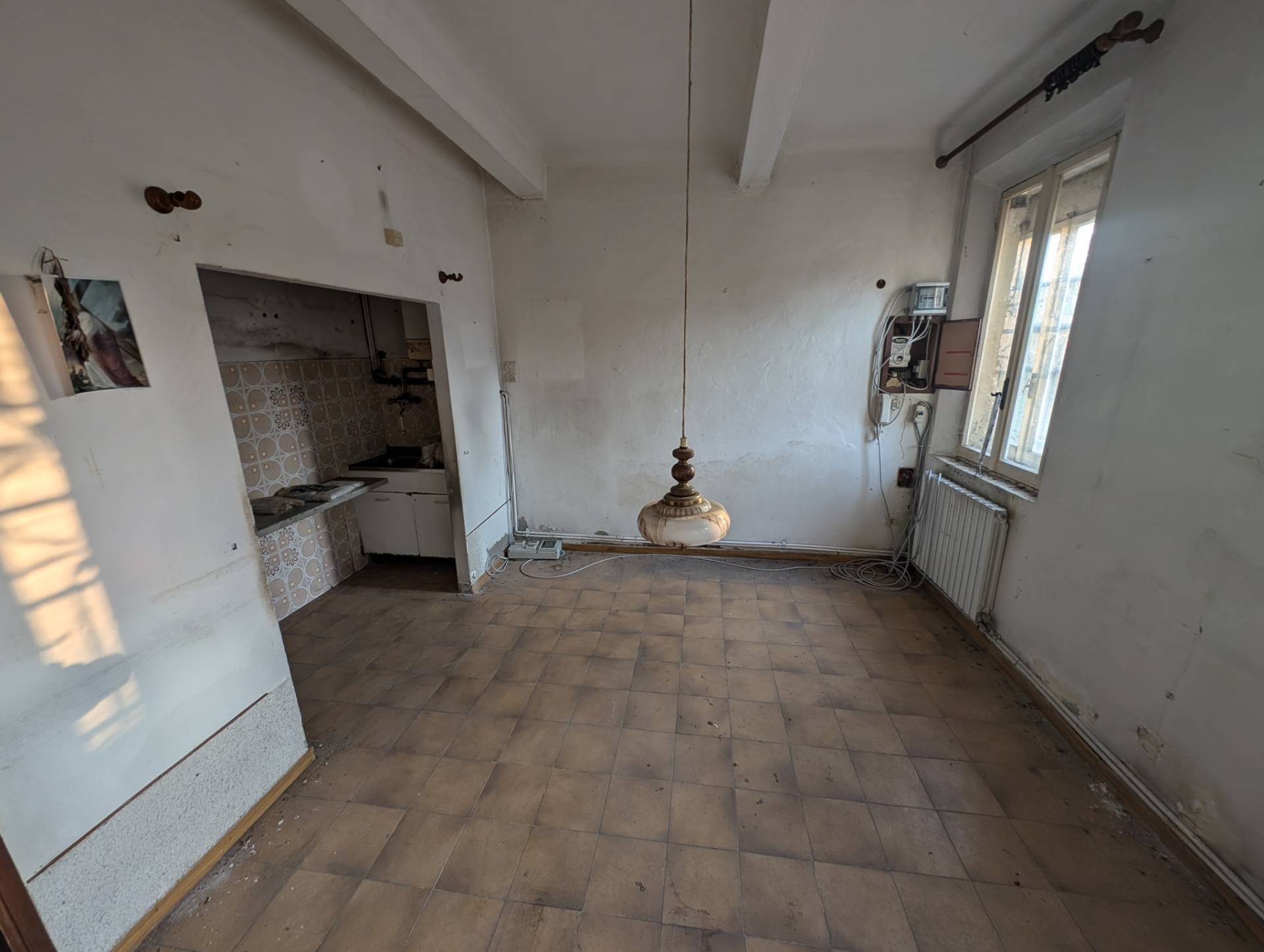 L'immobile, attualmente costituito da soggiorno, cucina, due letto e bagno, circondato da uno scoperto di circa 500 mq e completato da ampio magazzino/garage, anch'esso da ristrutturare.