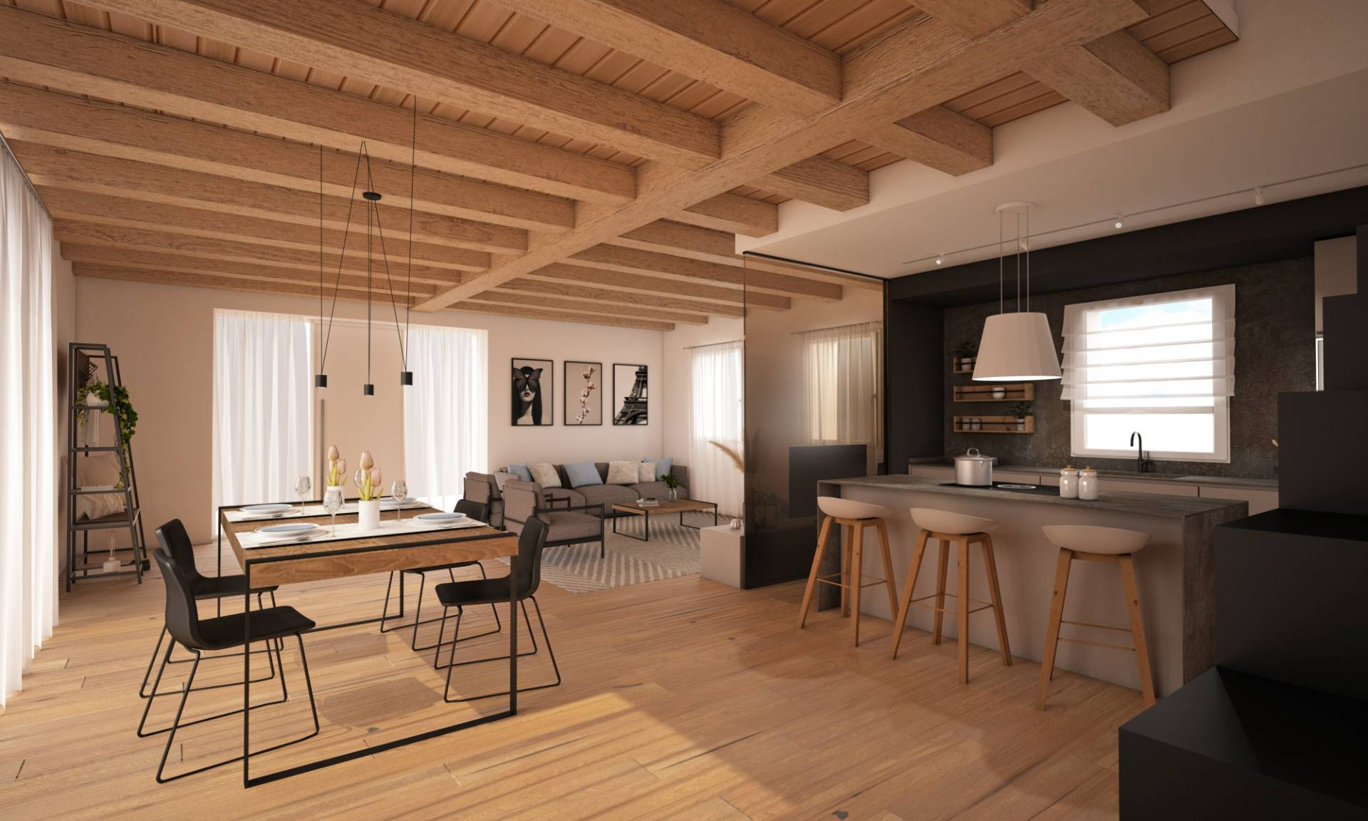Completano la soluzione il garage e la cantina, comodi per chi ha bisogno di spazi di deposito, hobby o parcheggio al riparo.