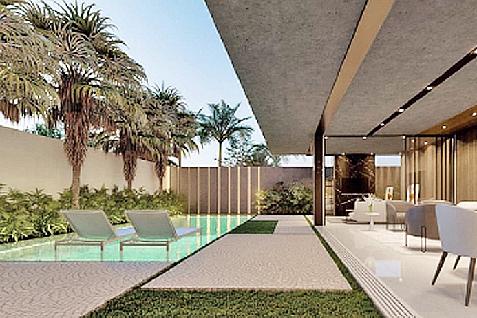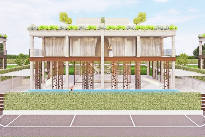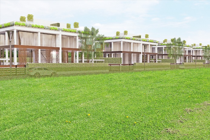 Il progetto prevede la realizzazione di ville bifamigliari e monofamigliari tutte dotate di piscina, parcheggio per automobili e giardini.