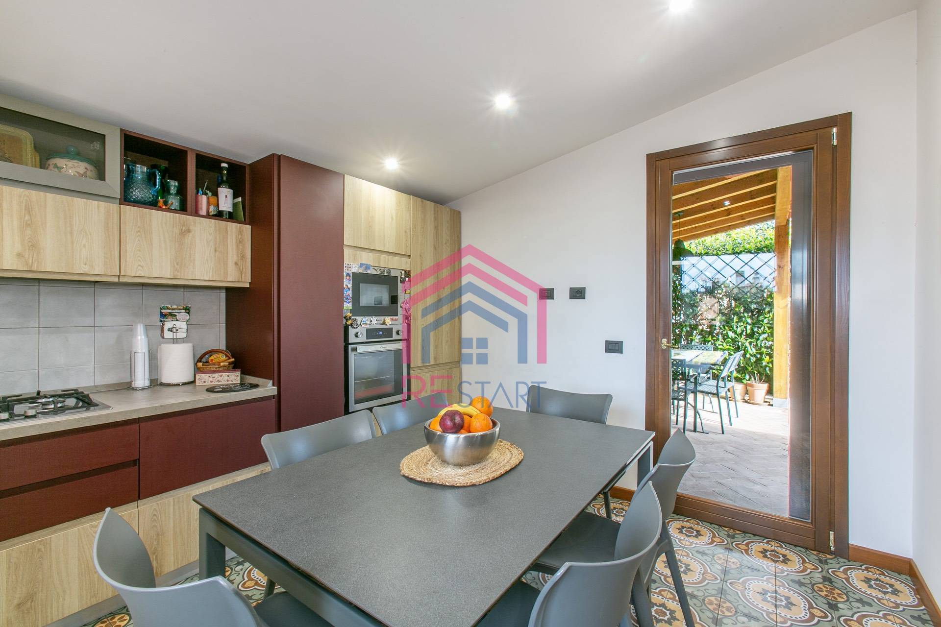 La villa si sviluppa su un unico livello e gode di una superficie di circa 100 mq, garantendo un'ottima suddivisione degli spazi e una perfetta distribuzione della luce naturale, gode di un giardino di circa 200 mq, che ruota su tutti e tre i lati, con alberi da frutto e ulivi, ed servito da un sistema di irrigazione e illuminazione perimetrale, inoltre vi un'ampia e comoda corte mattonata per i posti auto. Entrando nella villa ci accoglie un luminoso salone, una cucina abitabile servita da porta finestra che da accesso sull'ampia veranda, un disimpegno, la camera matrimoniale con bagno privato completo di box doccia, due camerette e un'ulteriore bagno con vasca.