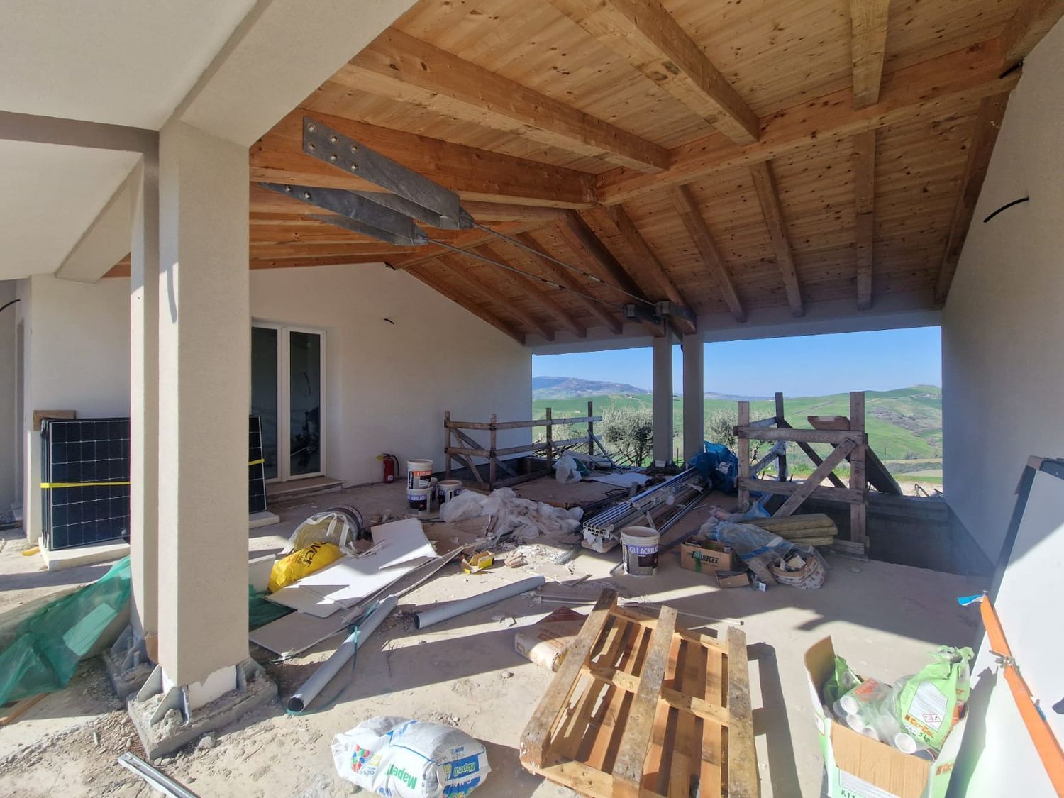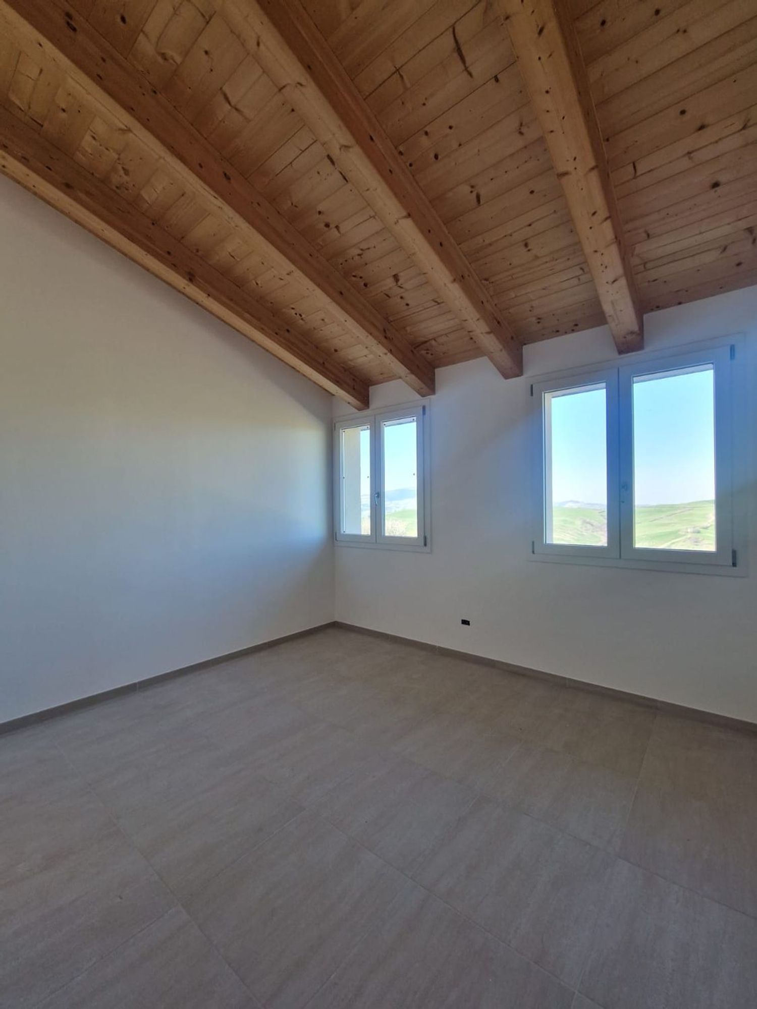 Gli interni sono curati con materiali esclusivi e raffinati, come infissi in PVC con sistema anti-ribaltamento, pavimenti in gres dai toni neutri e travi in legno a vista che conferiscono calore e comfort agli ambienti.