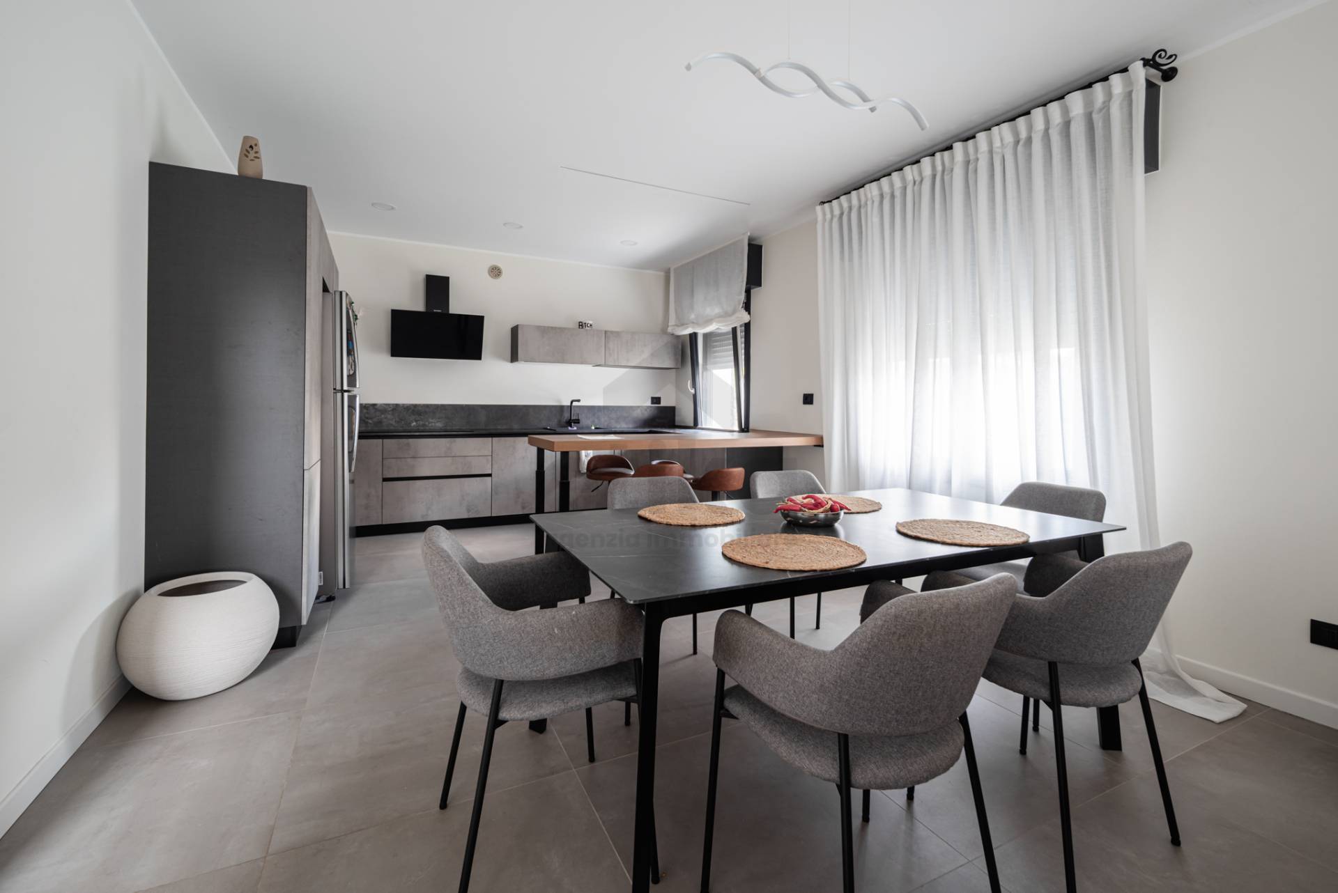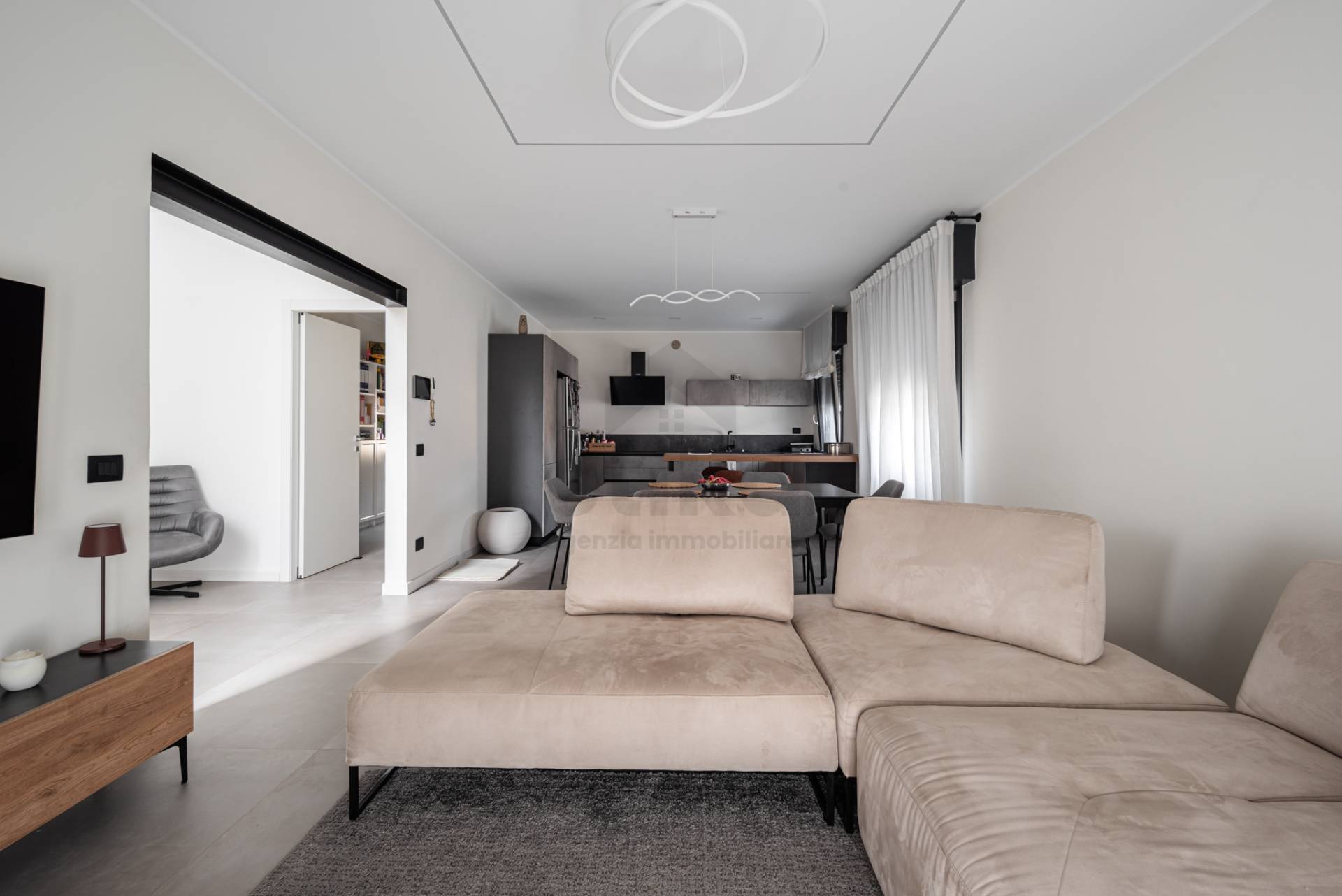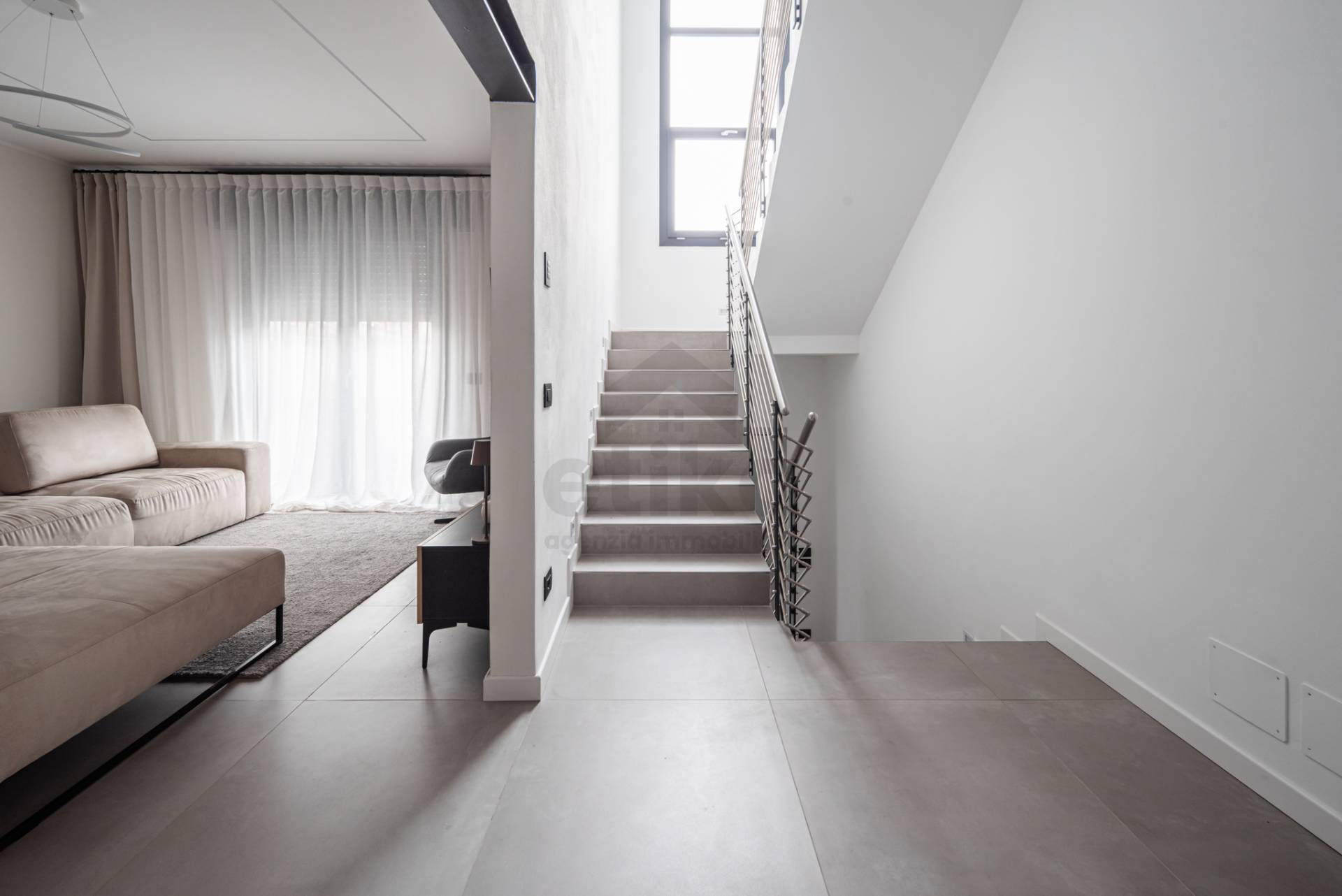 Le scale ci conducono ad una zona giorno di circa 40 mq, dove si percepisce immediatamente la sensazione di essere in un ambiente di classe, signorile e luminoso.