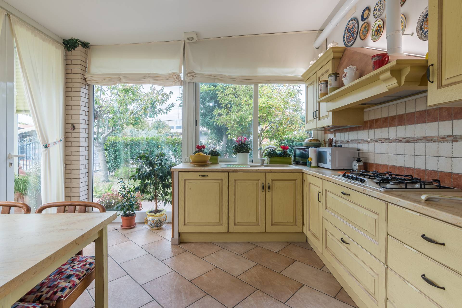 La cucina abitabile composta da ampie finestre che regalano luce naturale per tutto il giorno con una comoda uscita diretta sul giardino, ideale per portare allesterno pranzi estivi.
