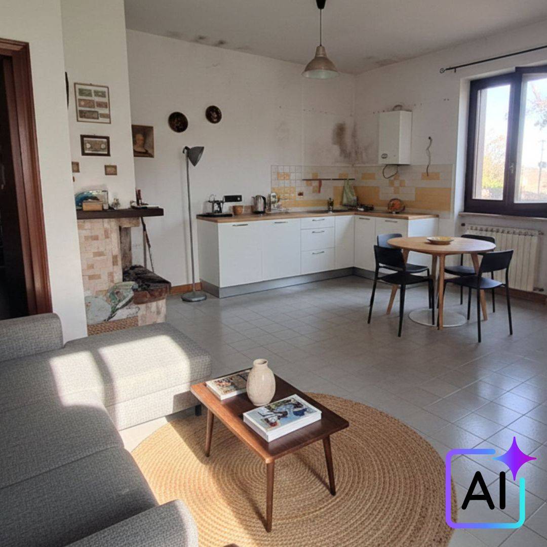 Al piano terra limmobile si apre su un luminoso soggiorno con angolo cottura e camino, ambiente caldo e accogliente, perfetto per la vita quotidiana e i momenti conviviali.