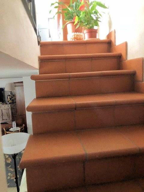 Ingresso principale dal portico al piano terreno rialzato: soggiorno, camera, bagno, ripostiglio e scala per scendere e per salire al piano primo con tre camere che si affacciano sulla terrazza e un bagno.