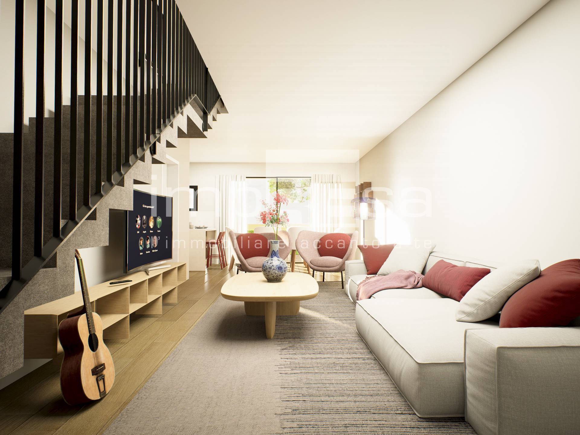 La zona giorno luminosa ideale per accogliere famiglia e ospiti, la scala a vista elegante porta al piano superiore.