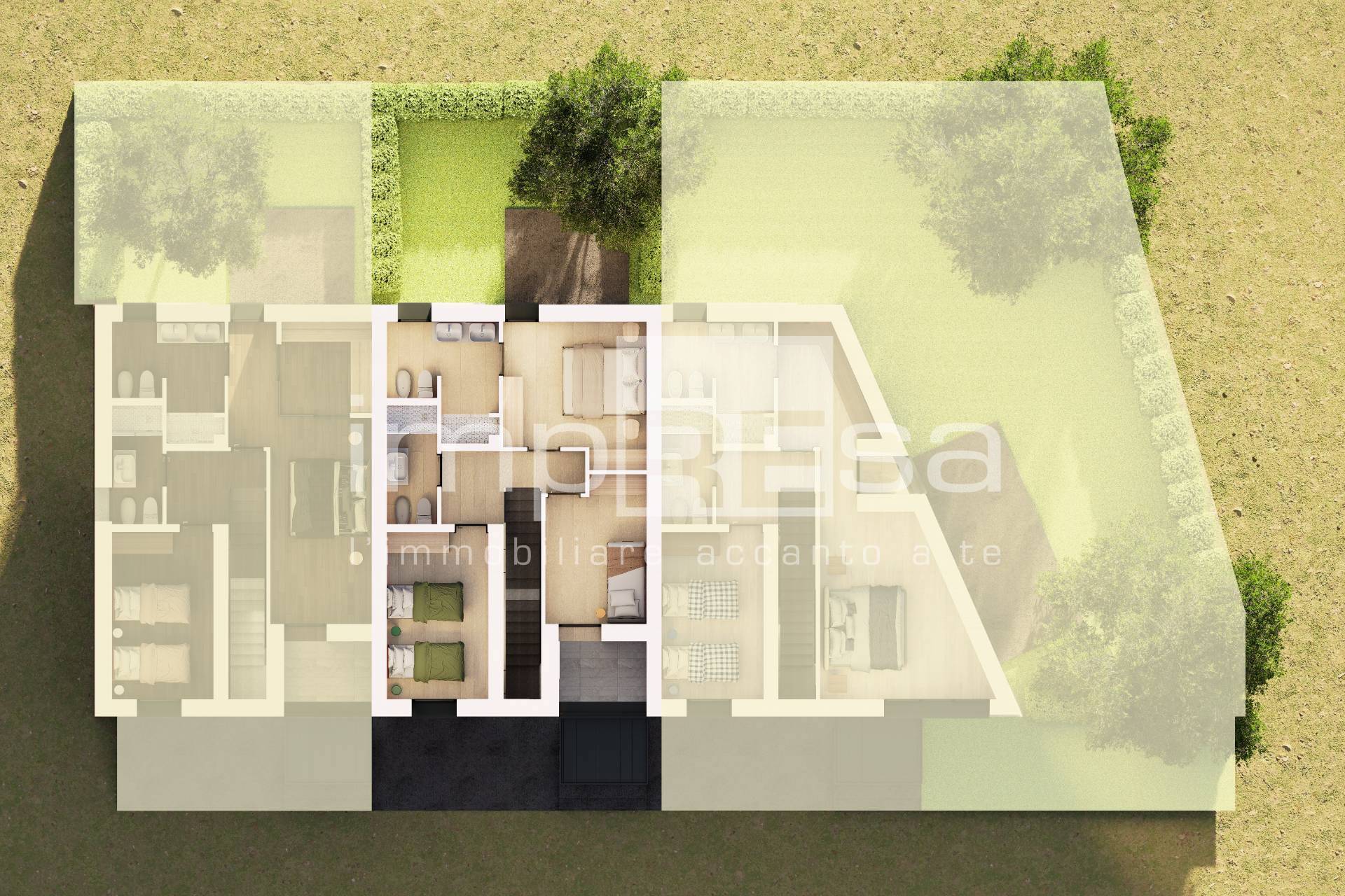Il piano primo sviluppa la zona notte con camera doppia, una camera singola, due bagni completi uno con doppio lavabo e la camera padronale molto grande.