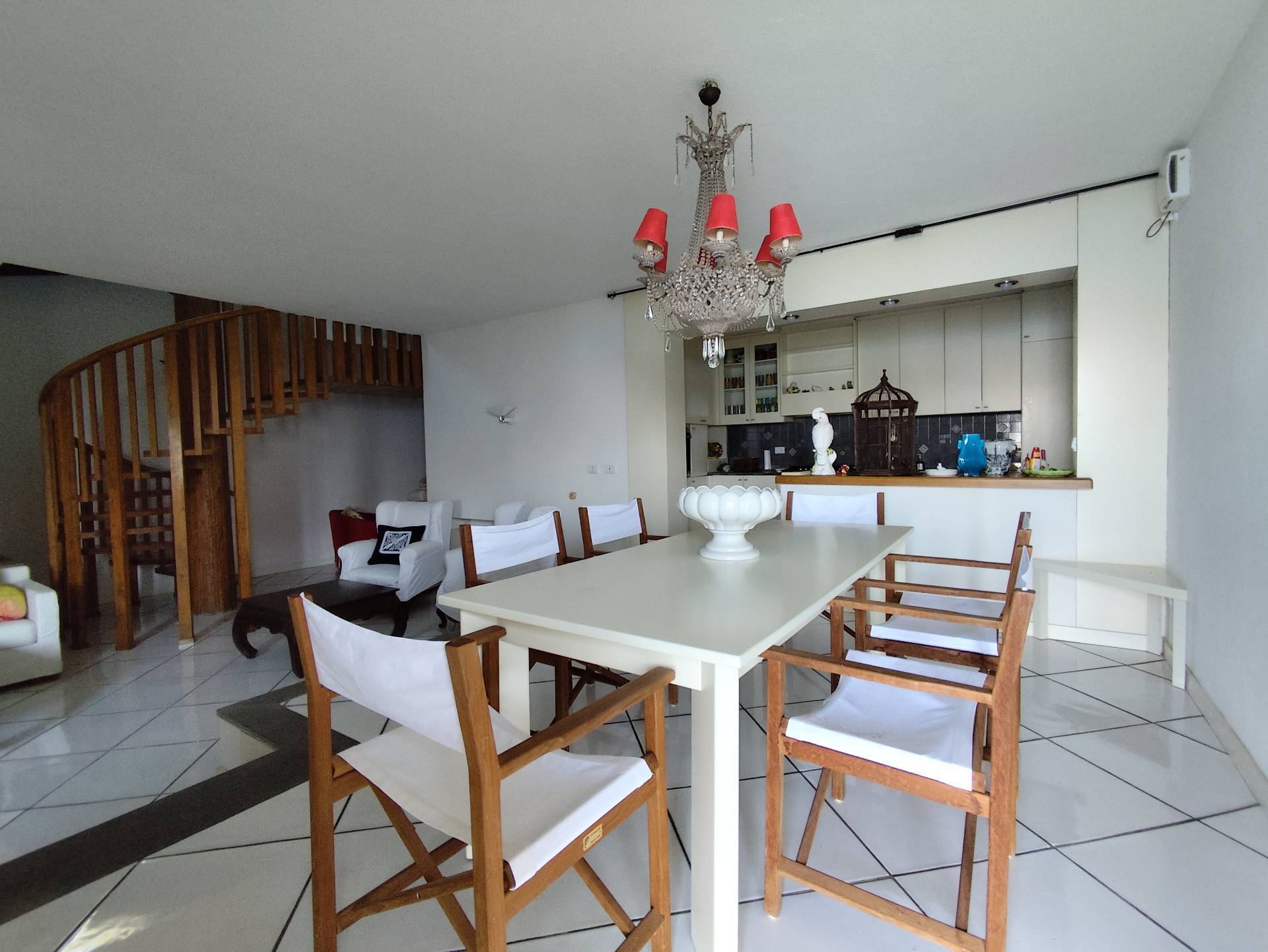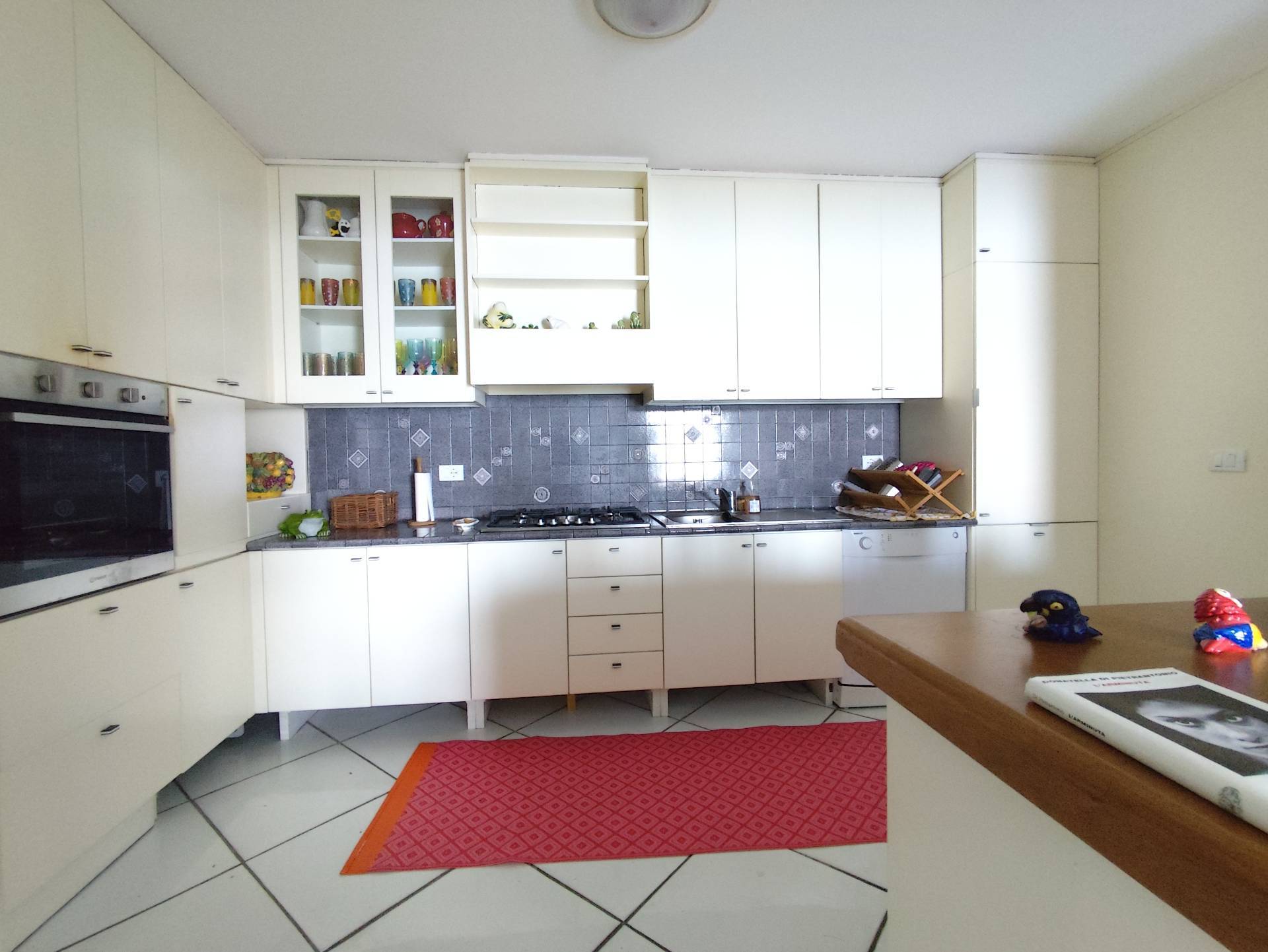 Al piano terra, la zona giorno si apre con una cucina moderna completamente attrezzata, dotata di area pranzo dedicata e comodo spazio dispensa in ambiente separato.