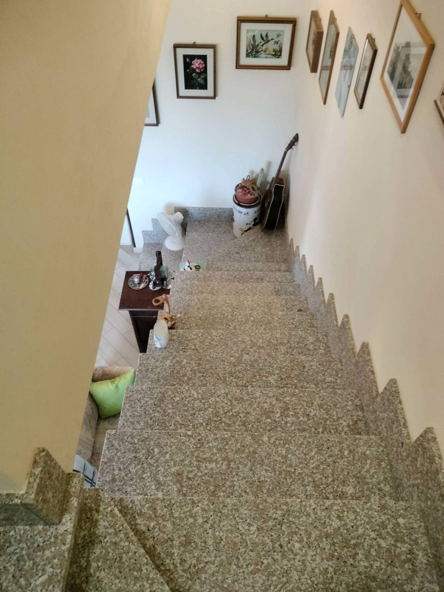 Si accede al piano terra in un disimpegno, salone con scala a vista che porta al piano superiore, cucina abitabile con uscita diretta sul portico, camera matrimoniale, antibagno e bagno.