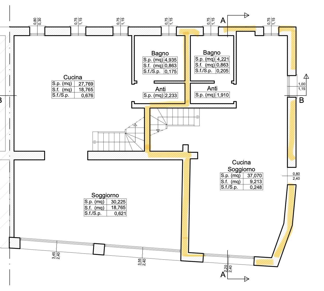 Piano terra con ingresso, soggiorno-pranzo-cucina, antibagno e bagno giorno.