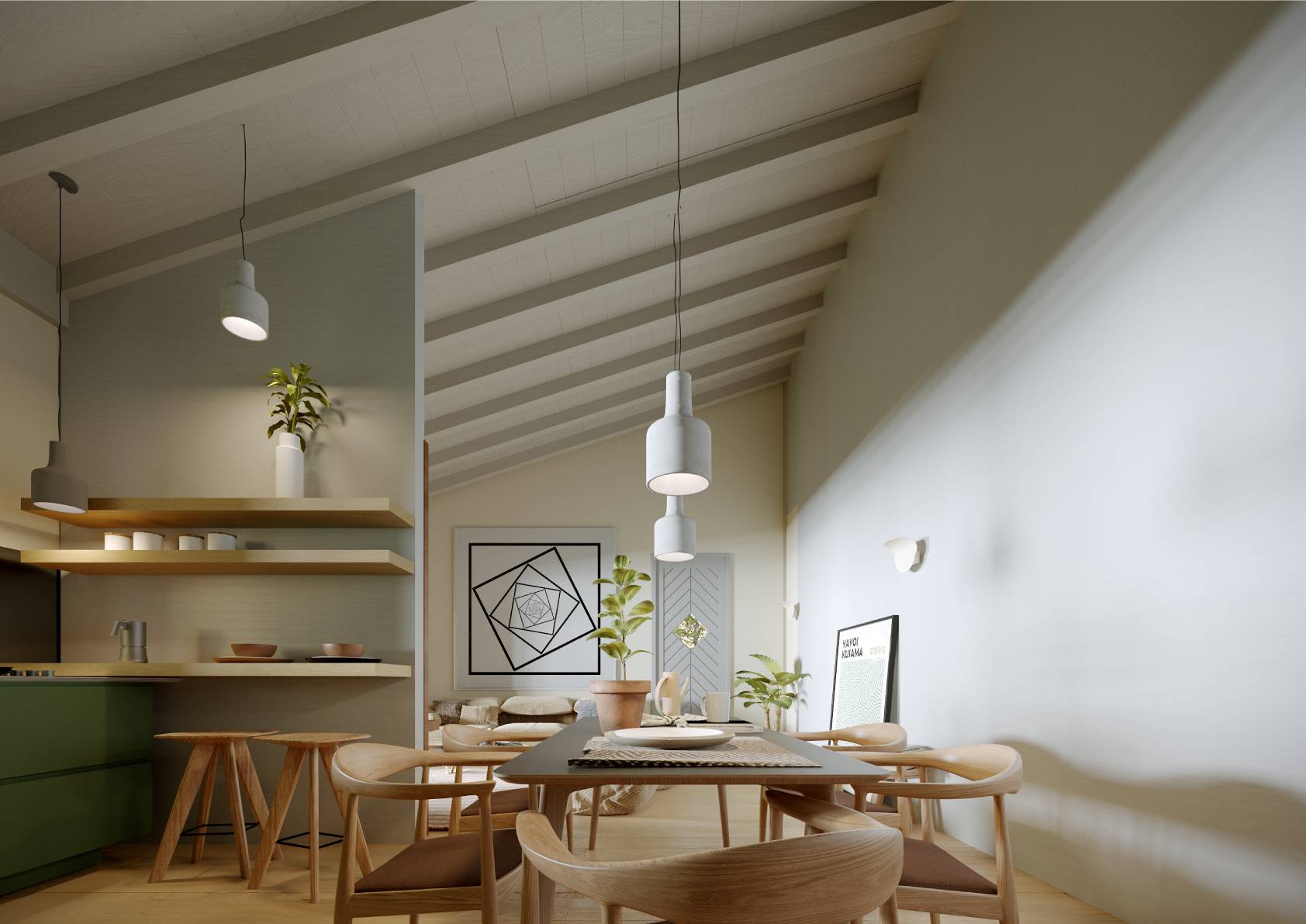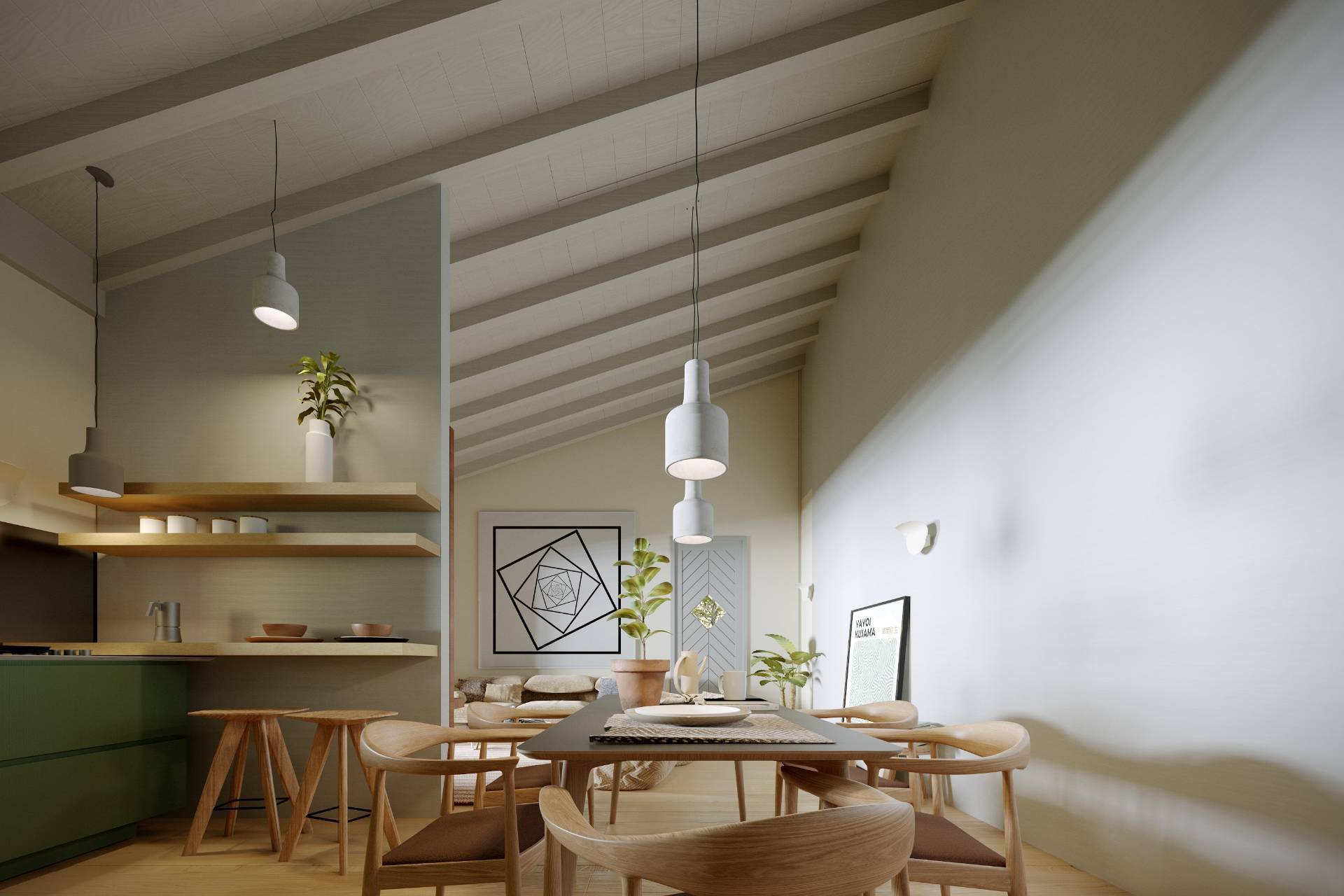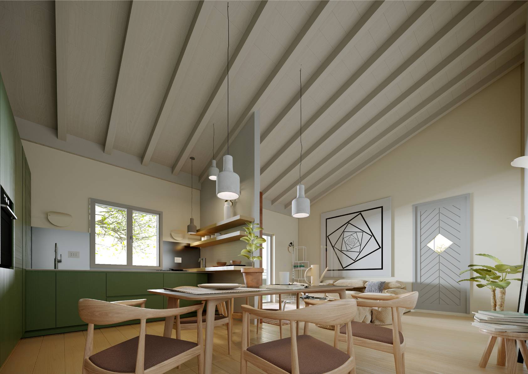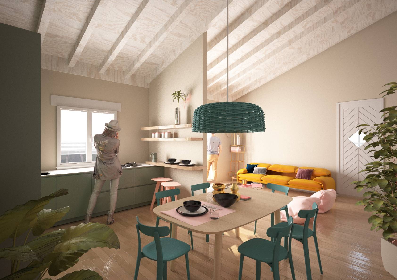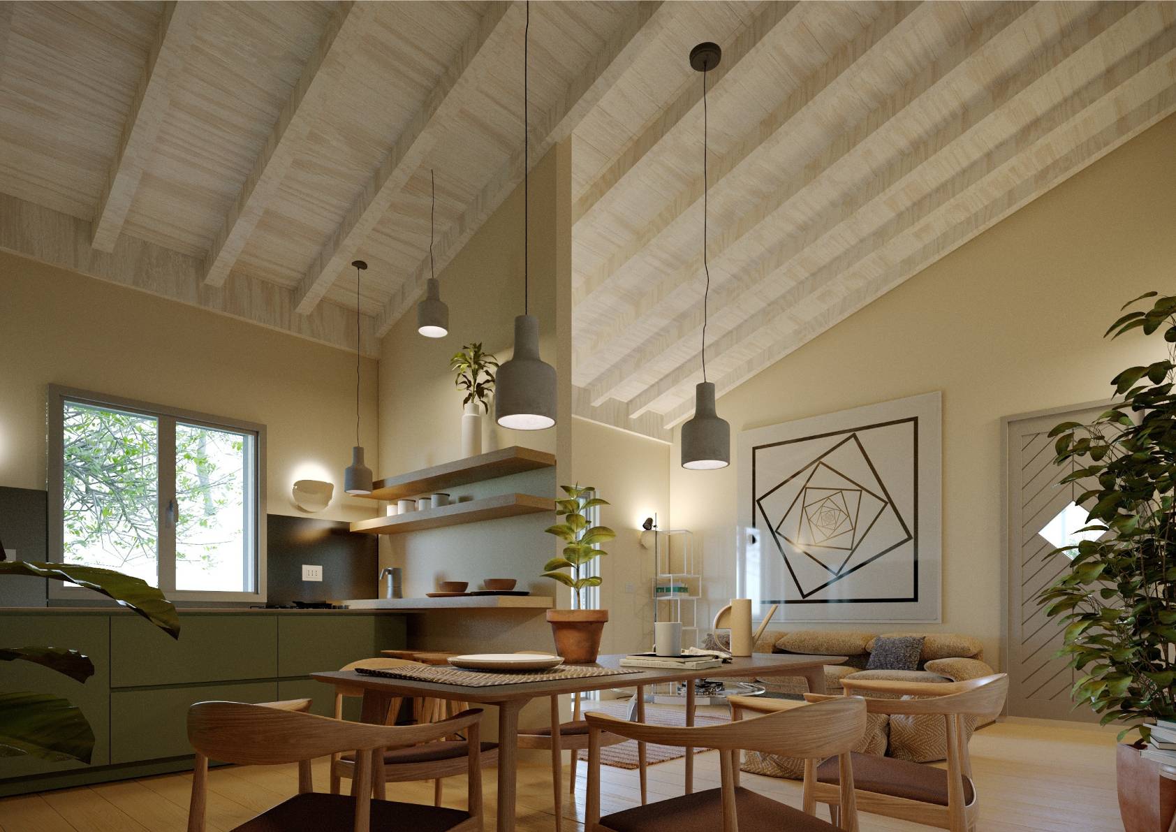 Al piano terra si trova un ampio e luminoso soggiorno, con una cucina a vista e accesso diretto ad un grazioso giardino privato, perfetto per trascorrere piacevoli momenti all'aria aperta.