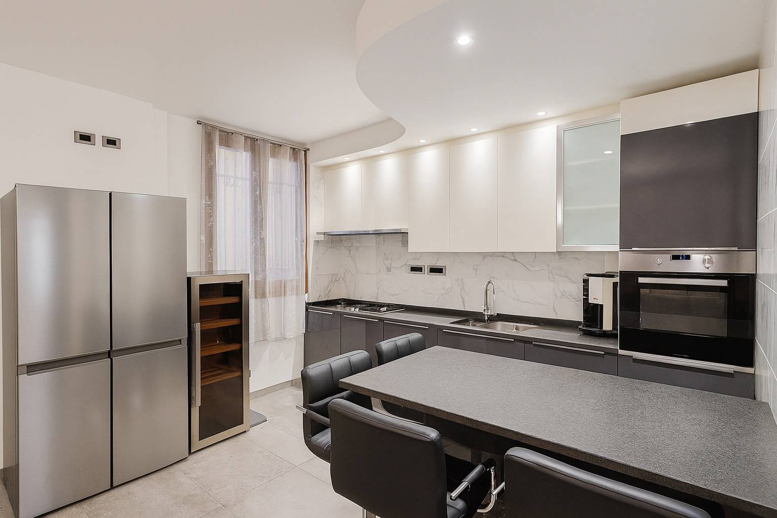 Da qui si accede allampio e luminoso soggiorno con angolo cottura, arricchito da moderne finiture e da un comodo e pratico ripostiglio.