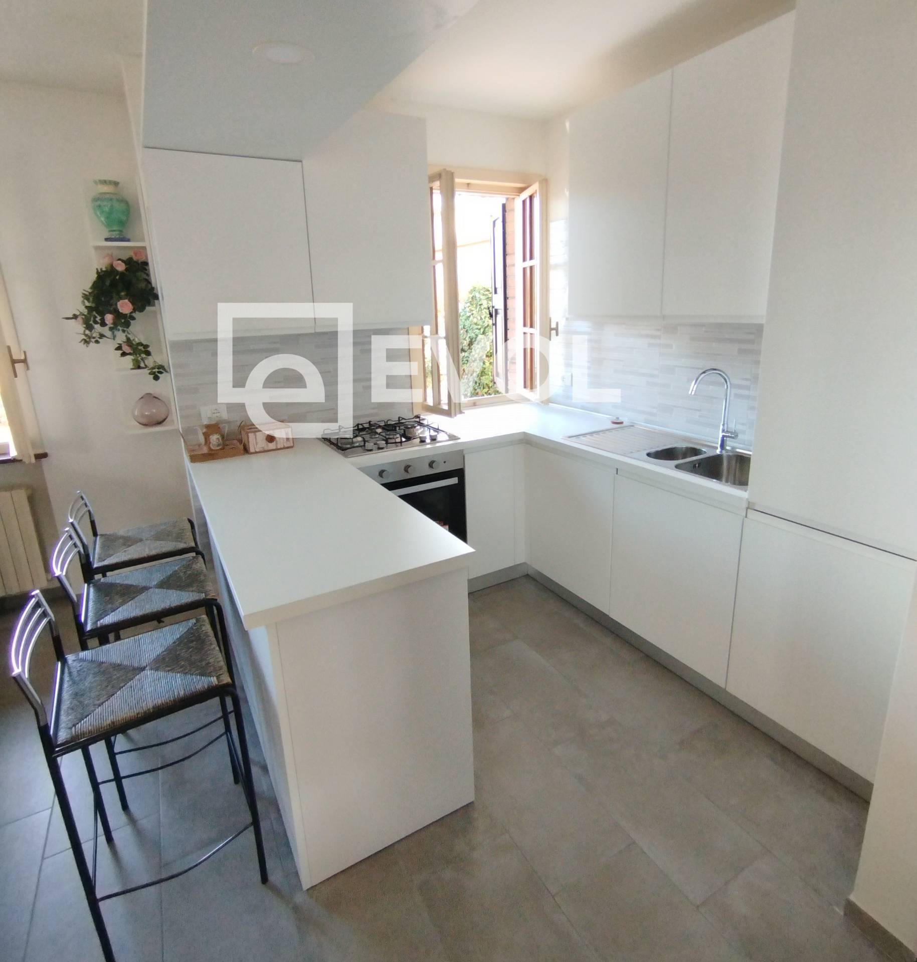 Il giardino di semplice manutenzione si estende su due lati della casa. L' esposizione ottimale verso Sud ed Ovest inonda gli ambienti di luce naturale tutto il giorno.o curato: cucina, soggiorno e camere da letto NUOVE e completamente arredate con mobili di design e qualit.
